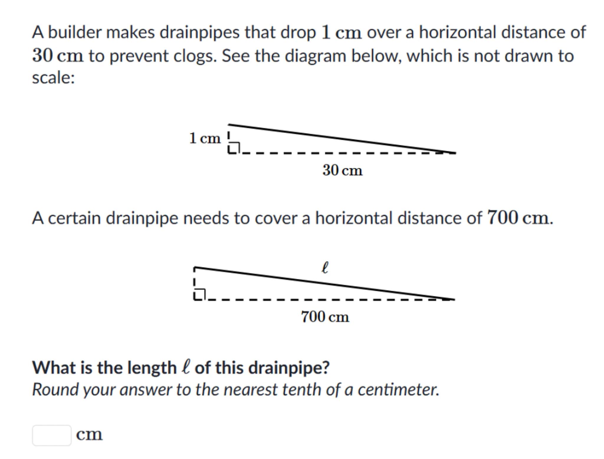 A builder makes drainpipes that drop over a horizontal distance of to prevent clogs. See the diagram below, which is not drawn to scale: