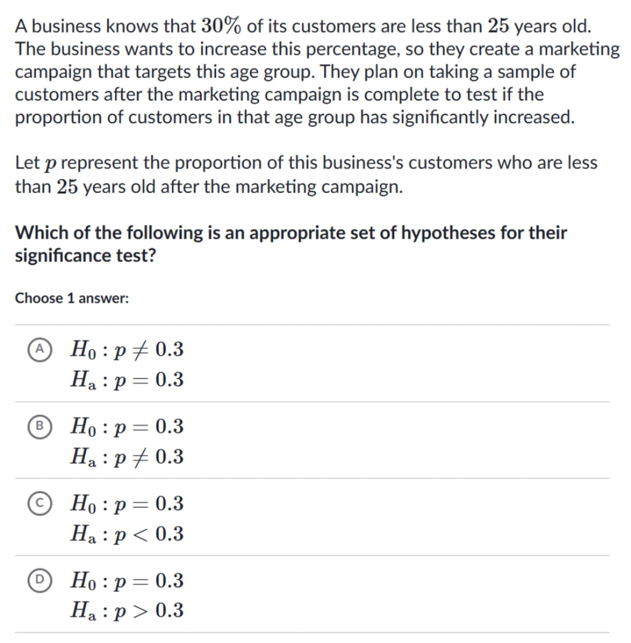 A business knows that of its customers are less than 25 years old. The business wants to increase this percentage, so they create a marketing campaign that targets this age group. They plan on taking a sample of customers after the marketing campaign is complete to test if the proportion of customers in that age group has significantly increased.