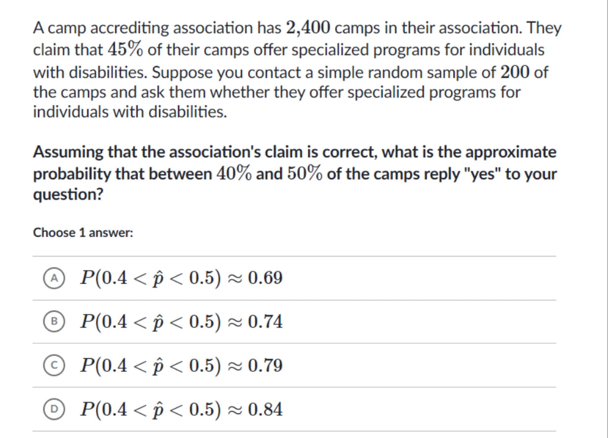 A camp accrediting association has 2,400 camps in their association. They claim that of their camps offer specialized programs for individuals with disabilities. Suppose you contact a simple random sample of 200 of the camps and ask them whether they offer specialized programs for individuals with disabilities.
