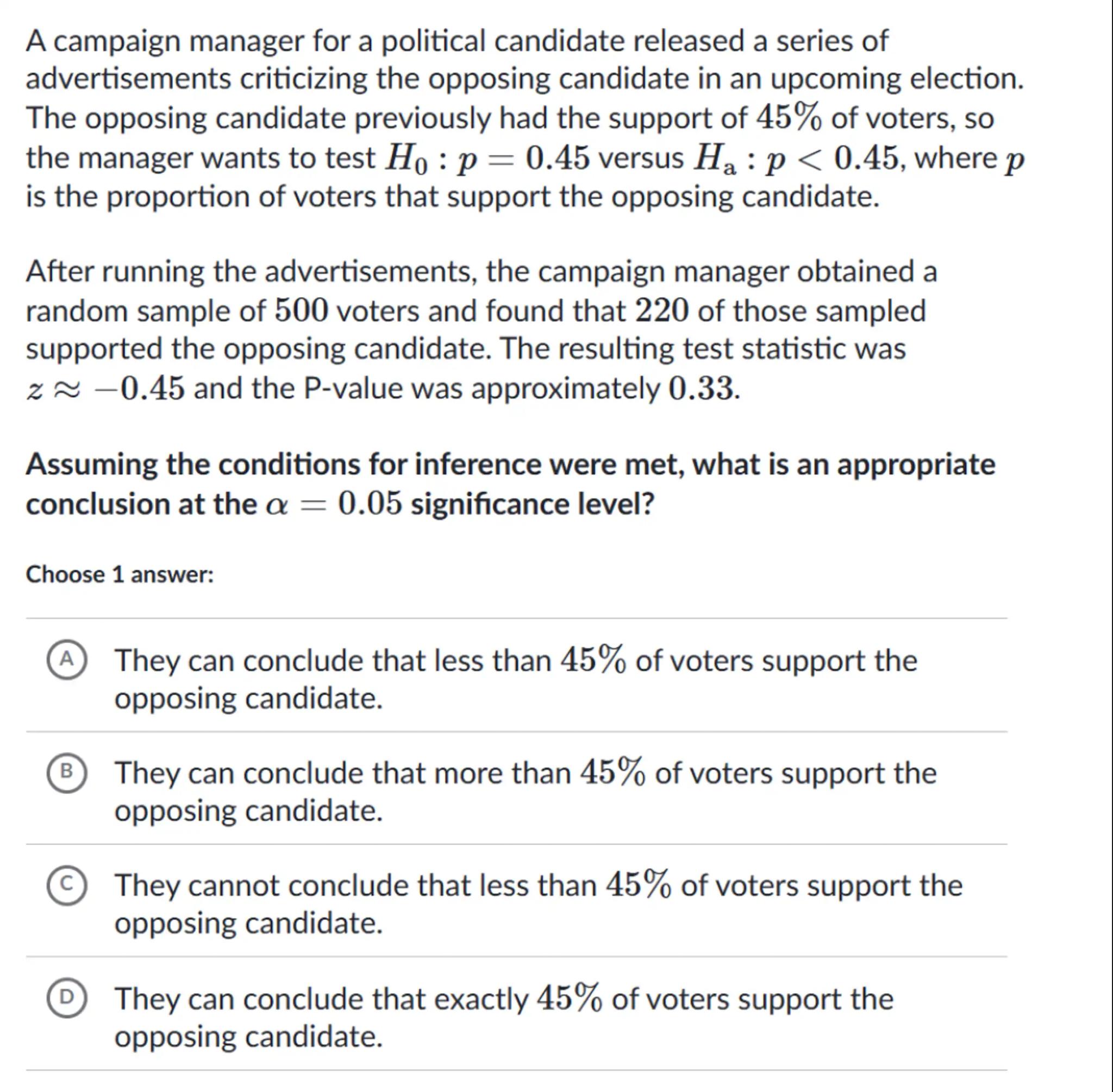 After running the advertisements, the campaign manager obtained a random sample of 500 voters and found that 220 of those sampled supported the opposing candidate. The resulting test statistic was and the P-value was approximately 0.33 .