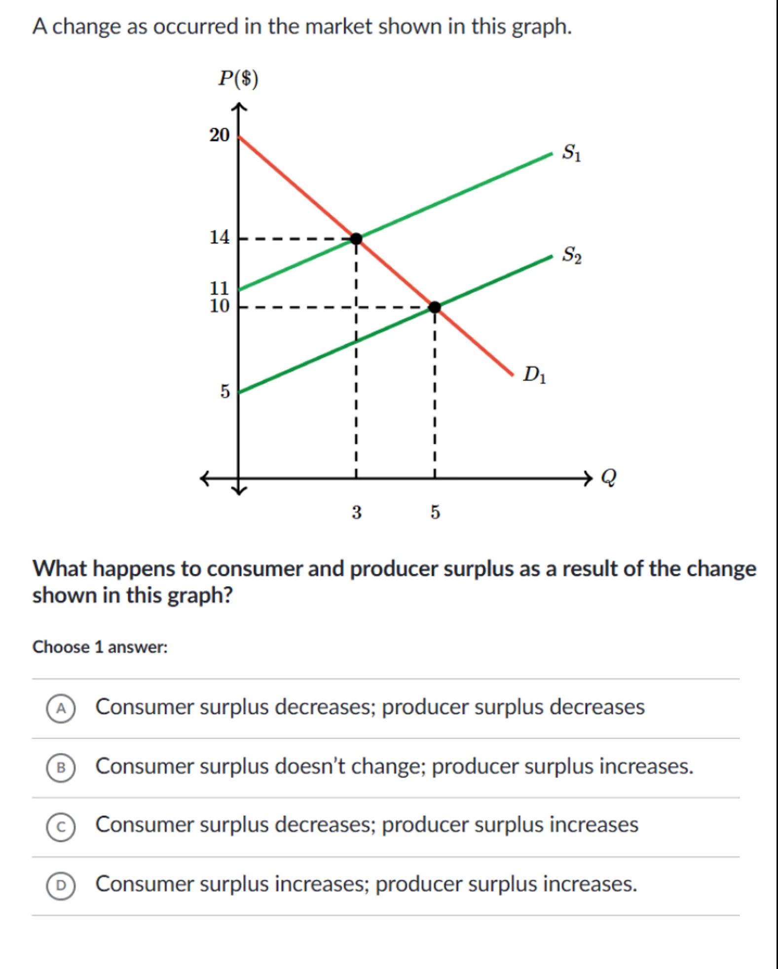 What happens to consumer and producer surplus as a result of the change shown in this graph?