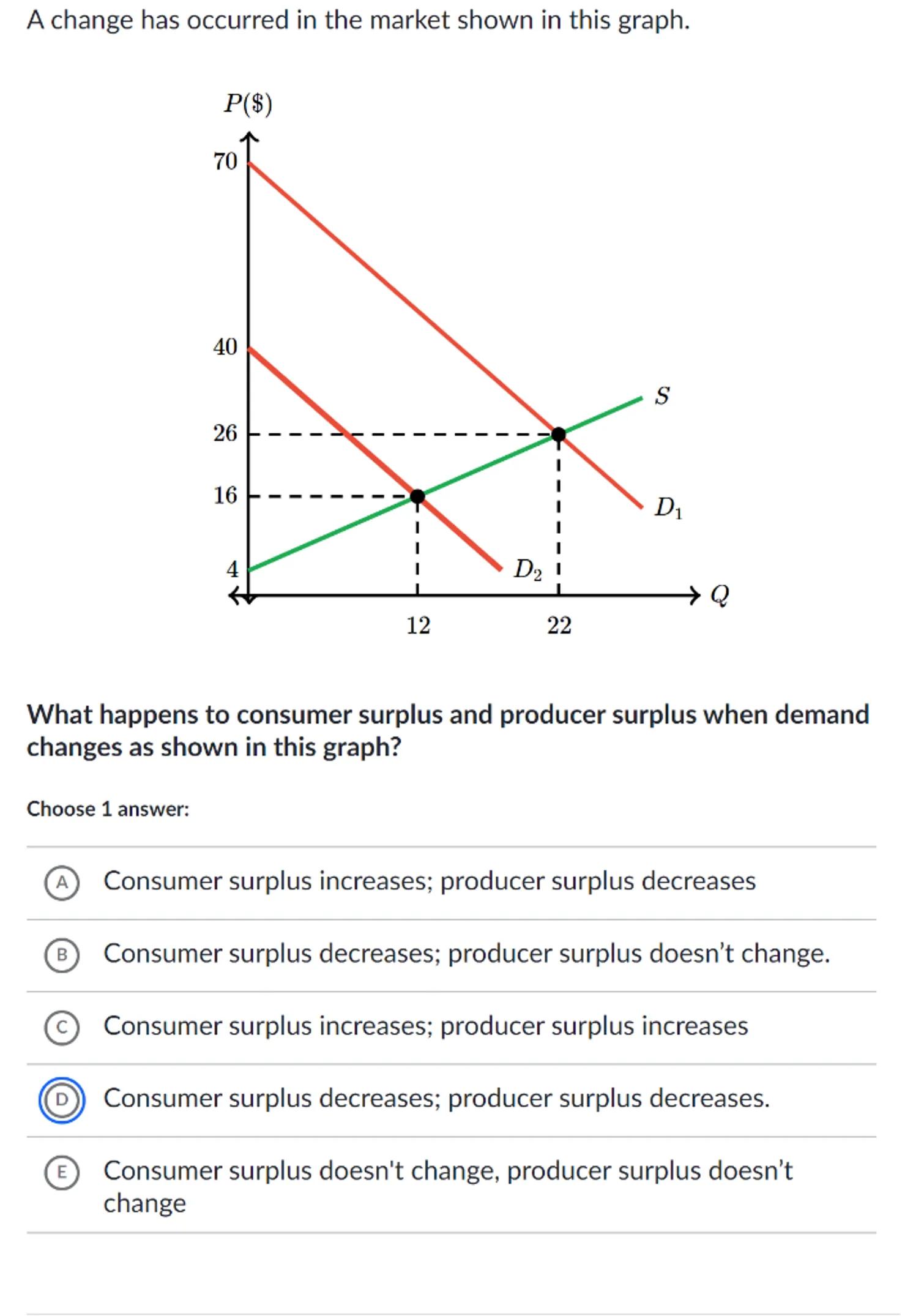What happens to consumer surplus and producer surplus when demand changes as shown in this graph?