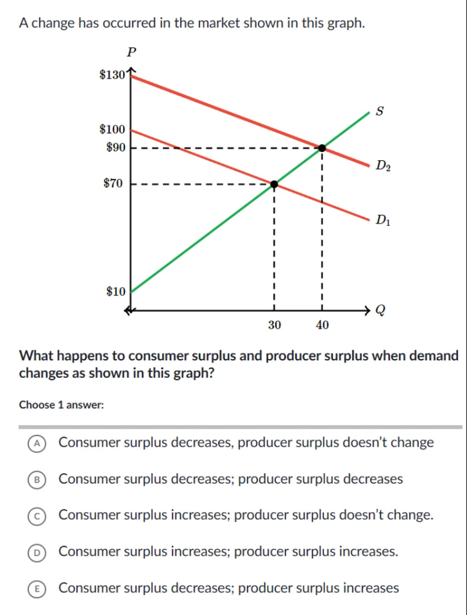 What happens to consumer surplus and producer surplus when demand changes as shown in this graph?