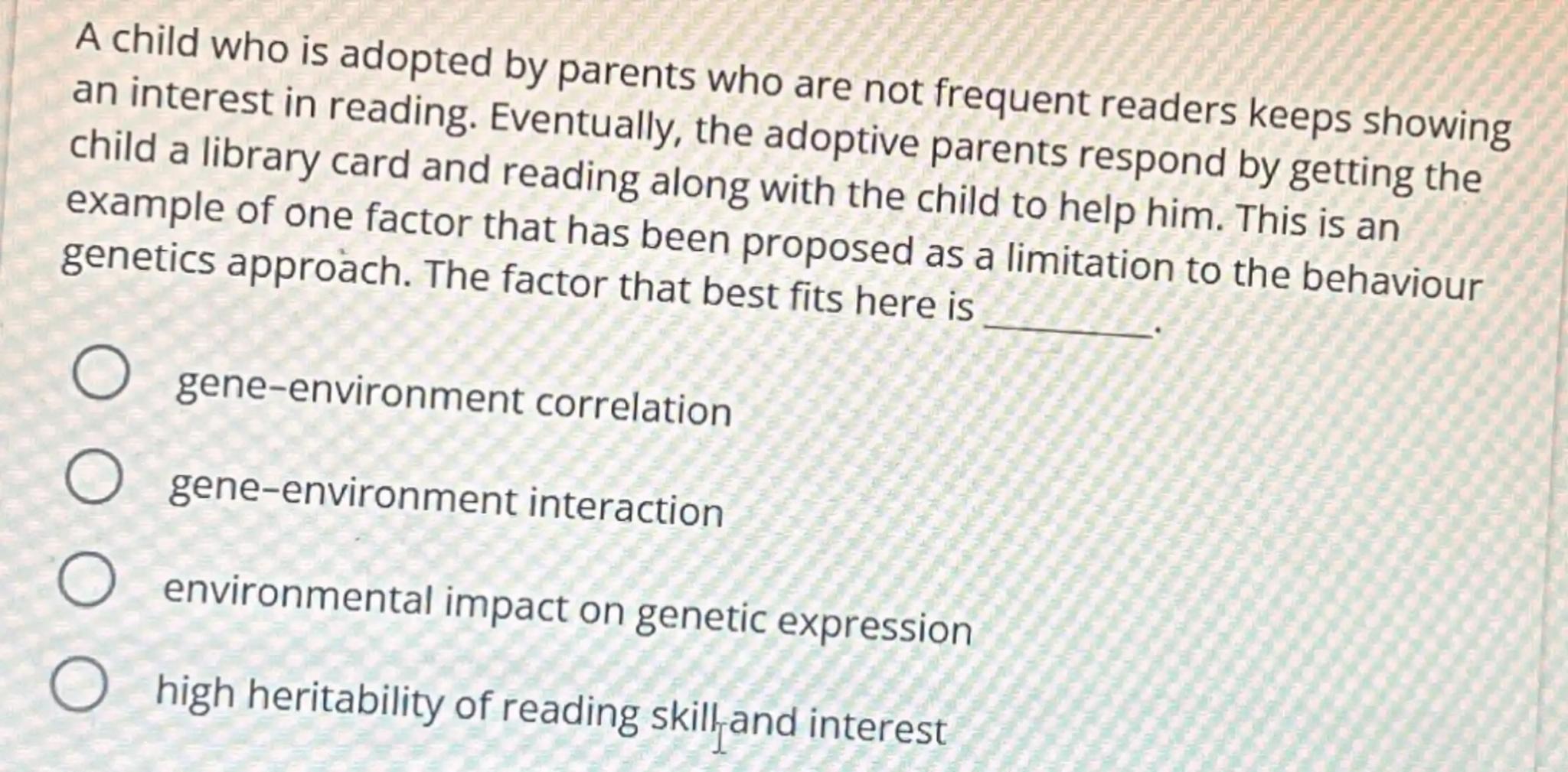 A child who is adopted by parents who are not frequent readers keeps showing an interest in reading. Eventually, the adoptive parents respond by getting the child a library card and reading along with the child to help him. This is an example of one factor that has been proposed as a limitation to the behaviour genetics approach. The factor that best fits here is