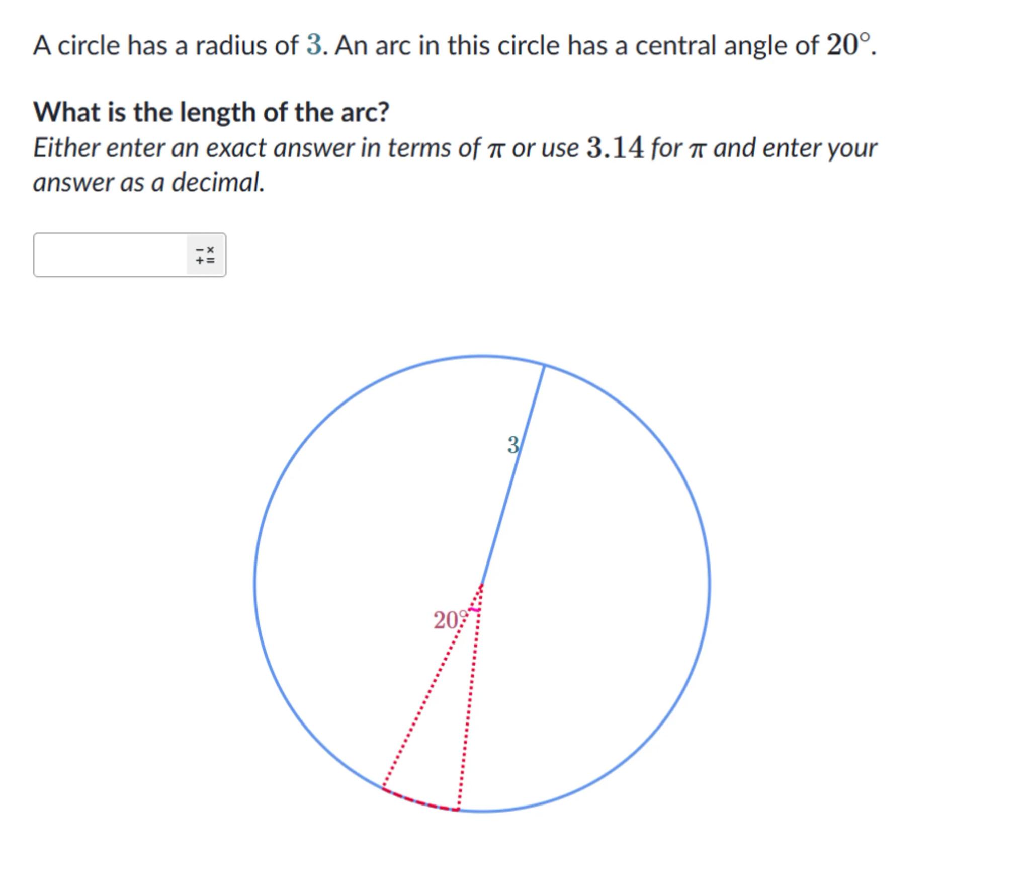 A circle has a radius of 3 . An arc in this circle has a central angle of .
