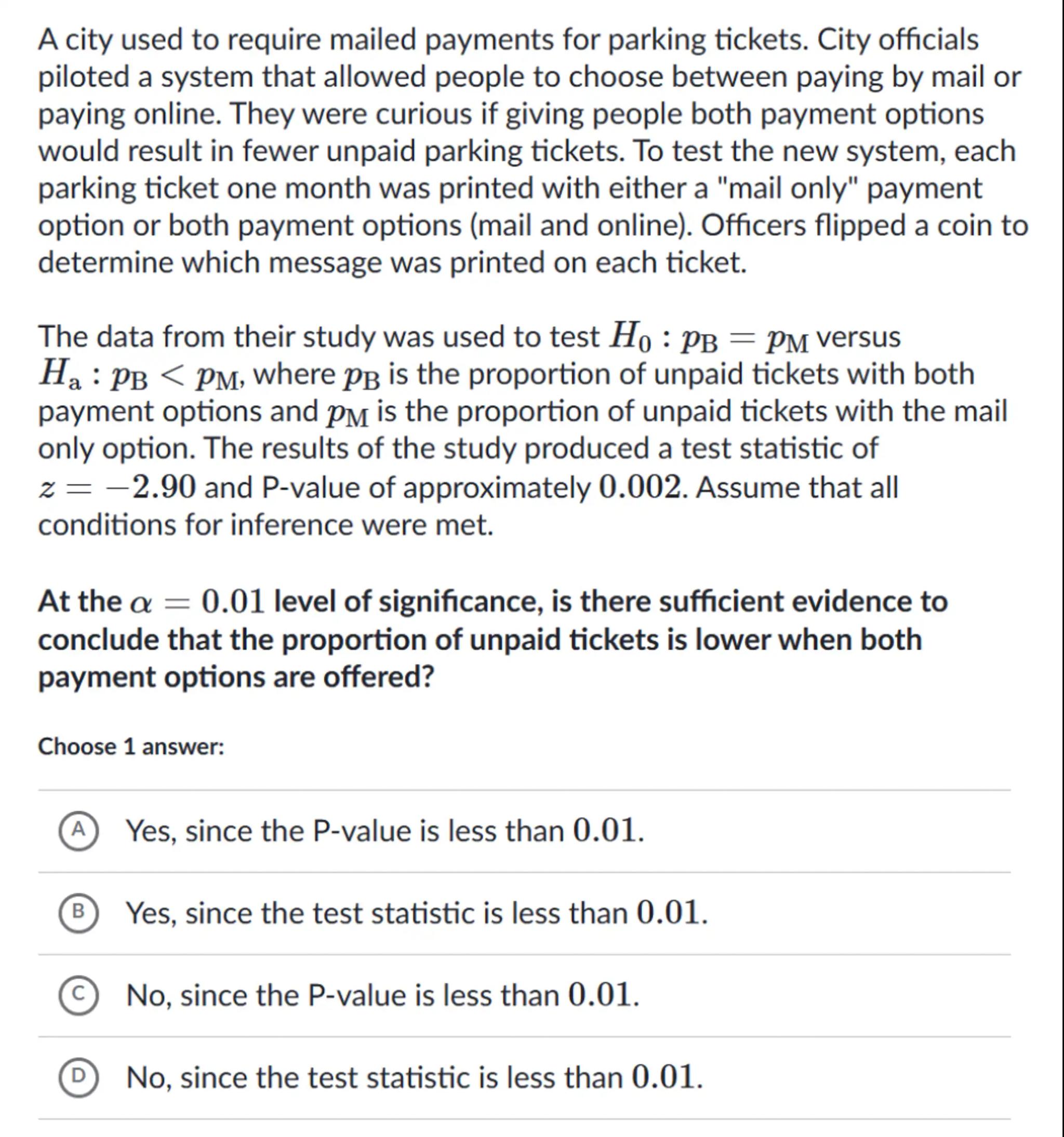 The data from their study was used to test versus , where is the proportion of unpaid tickets with both payment options and is the proportion of unpaid tickets with the mail only option. The results of the study produced a test statistic of and -value of approximately 0.002 . Assume that all conditions for inference were met.