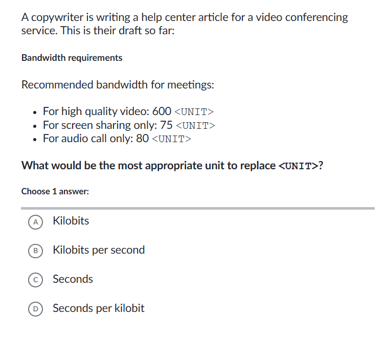 Sure, let's address the question about the appropriate unit for bandwidth requirements for video conferencing.