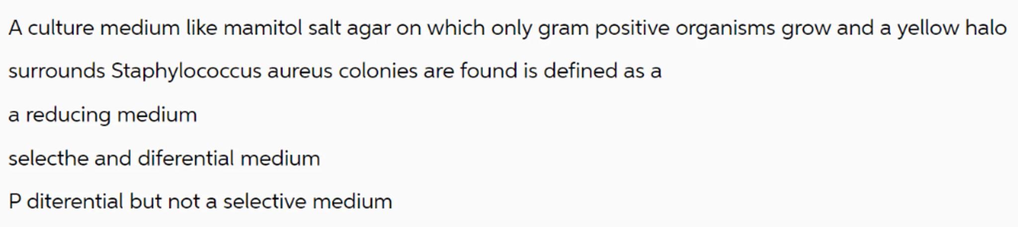 A culture medium like mamitol salt agar on which only gram positive organisms grow and a yellow halo surrounds Staphylococcus aureus colonies are found is defined as a a reducing medium selecthe and diferential medium P diterential but not a selective medium