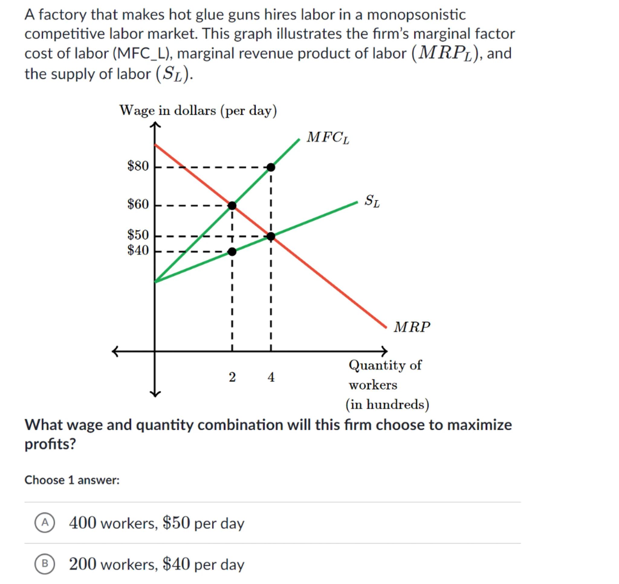 A factory that makes hot glue guns hires labor in a monopsonistic competitive labor market. This graph illustrates the firm's marginal factor cost of labor (MFC_L), marginal revenue product of labor , and the supply of labor .