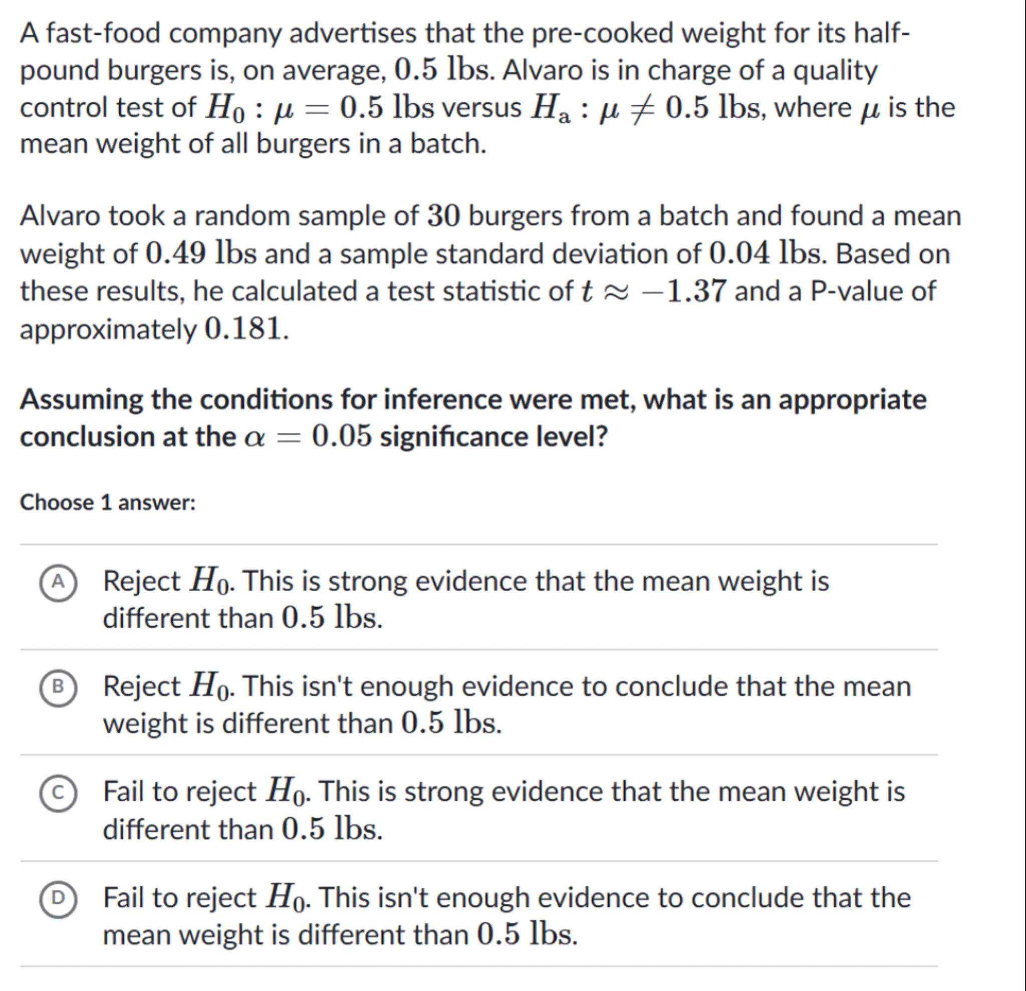 Alvaro took a random sample of 30 burgers from a batch and found a mean weight of and a sample standard deviation of . Based on these results, he calculated a test statistic of and a P-value of approximately 0.181.