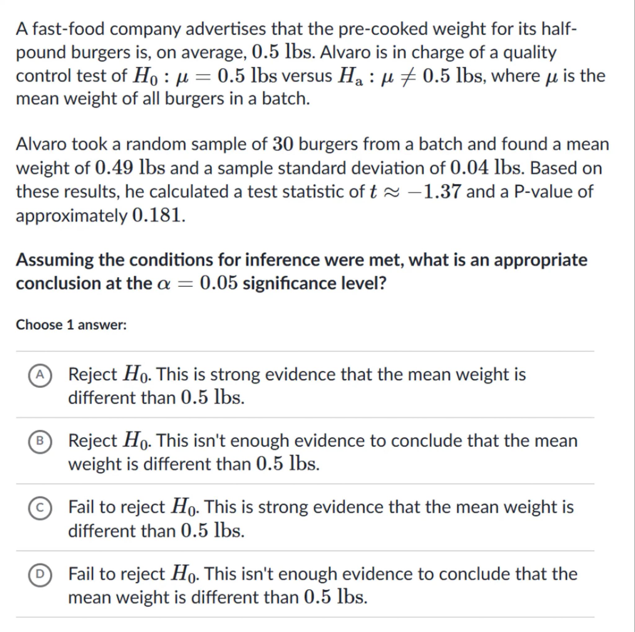 Alvaro took a random sample of 30 burgers from a batch and found a mean weight of and a sample standard deviation of . Based on these results, he calculated a test statistic of and a -value of approximately 0.181.