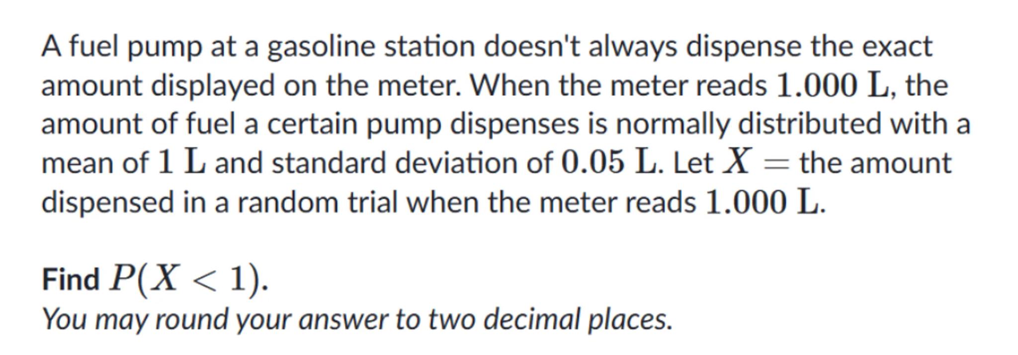 A fuel pump at a gasoline station doesn't always dispense the exact amount displayed on the meter. When the meter reads , the amount of fuel a certain pump dispenses is normally distributed with a mean of and standard deviation of . Let the amount dispensed in a random trial when the meter reads .