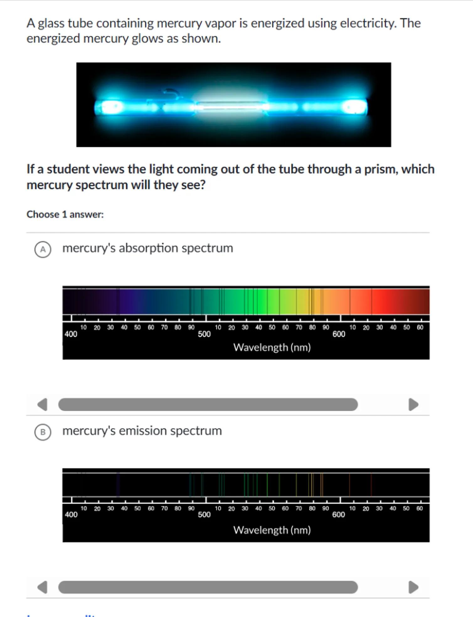 If a student views the light coming out of the tube through a prism, which mercury spectrum will they see?