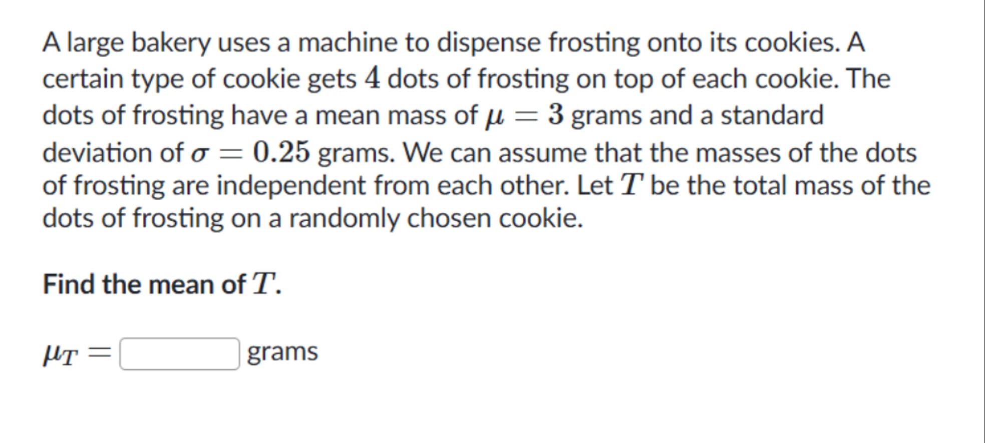 A large bakery uses a machine to dispense frosting onto its cookies. A certain type of cookie gets 4 dots of frosting on top of each cookie. The dots of frosting have a mean mass of grams and a standard deviation of grams. We can assume that the masses of the dots of frosting are independent from each other. Let be the total mass of the dots of frosting on a randomly chosen cookie.