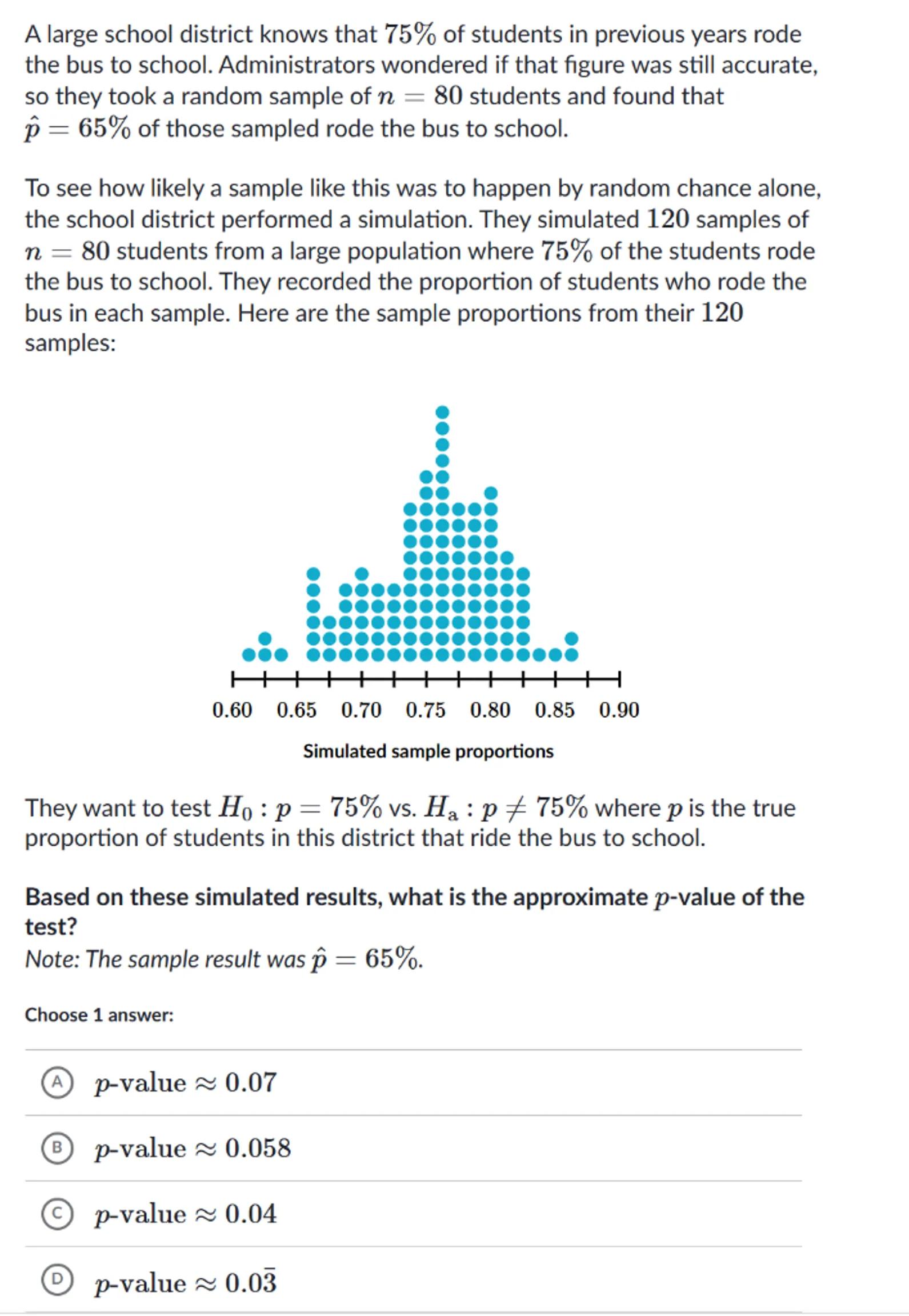 To see how likely a sample like this was to happen by random chance alone, the school district performed a simulation. They simulated 120 samples of students from a large population where of the students rode the bus to school. They recorded the proportion of students who rode the bus in each sample. Here are the sample proportions from their 120 samples: