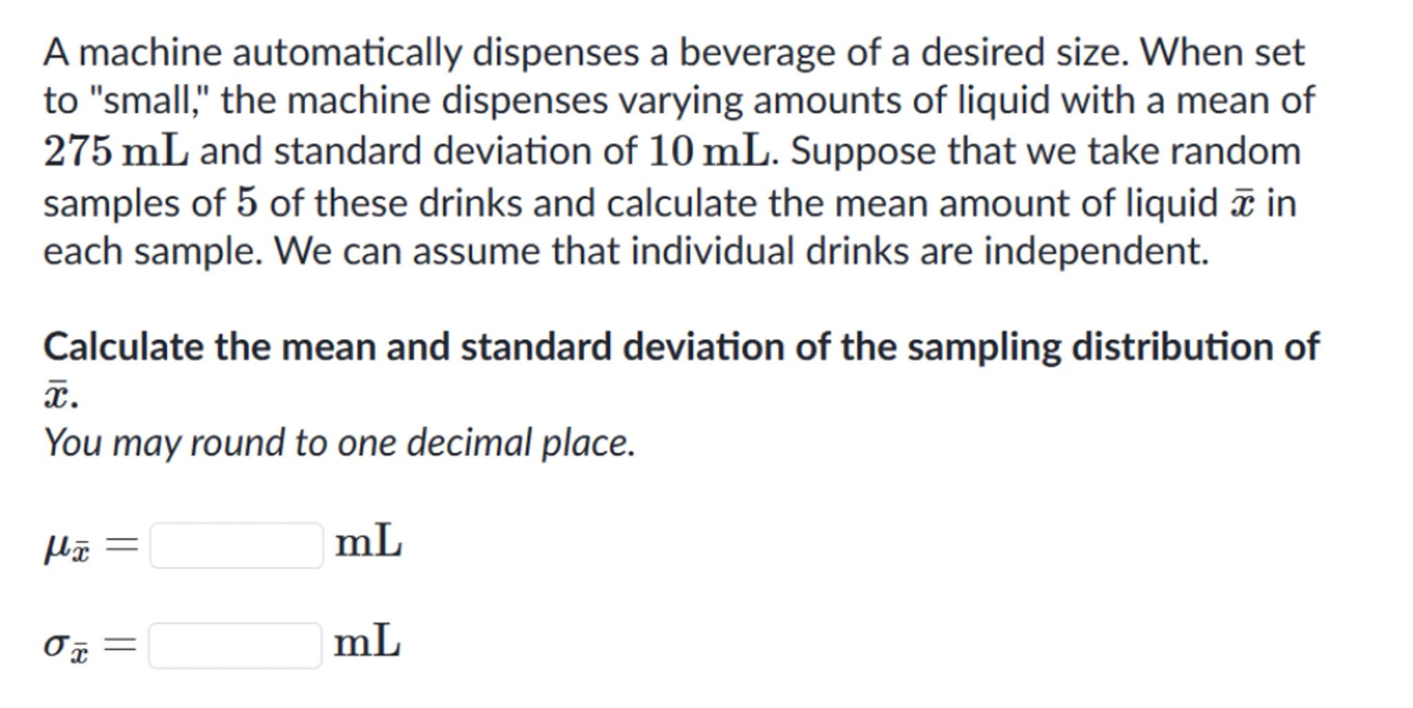 A machine automatically dispenses a beverage of a desired size. When set to "small," the machine dispenses varying amounts of liquid with a mean of and standard deviation of . Suppose that we take random samples of 5 of these drinks and calculate the mean amount of liquid in each sample. We can assume that individual drinks are independent.