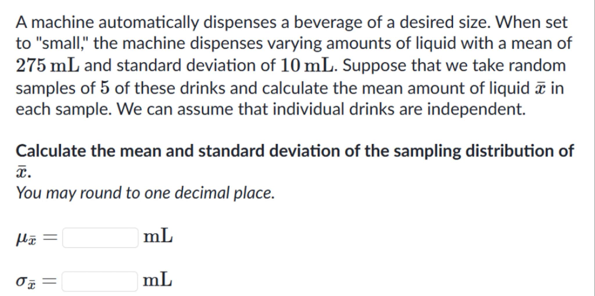 A machine automatically dispenses a beverage of a desired size. When set to "small," the machine dispenses varying amounts of liquid with a mean of and standard deviation of . Suppose that we take random samples of 5 of these drinks and calculate the mean amount of liquid in each sample. We can assume that individual drinks are independent.