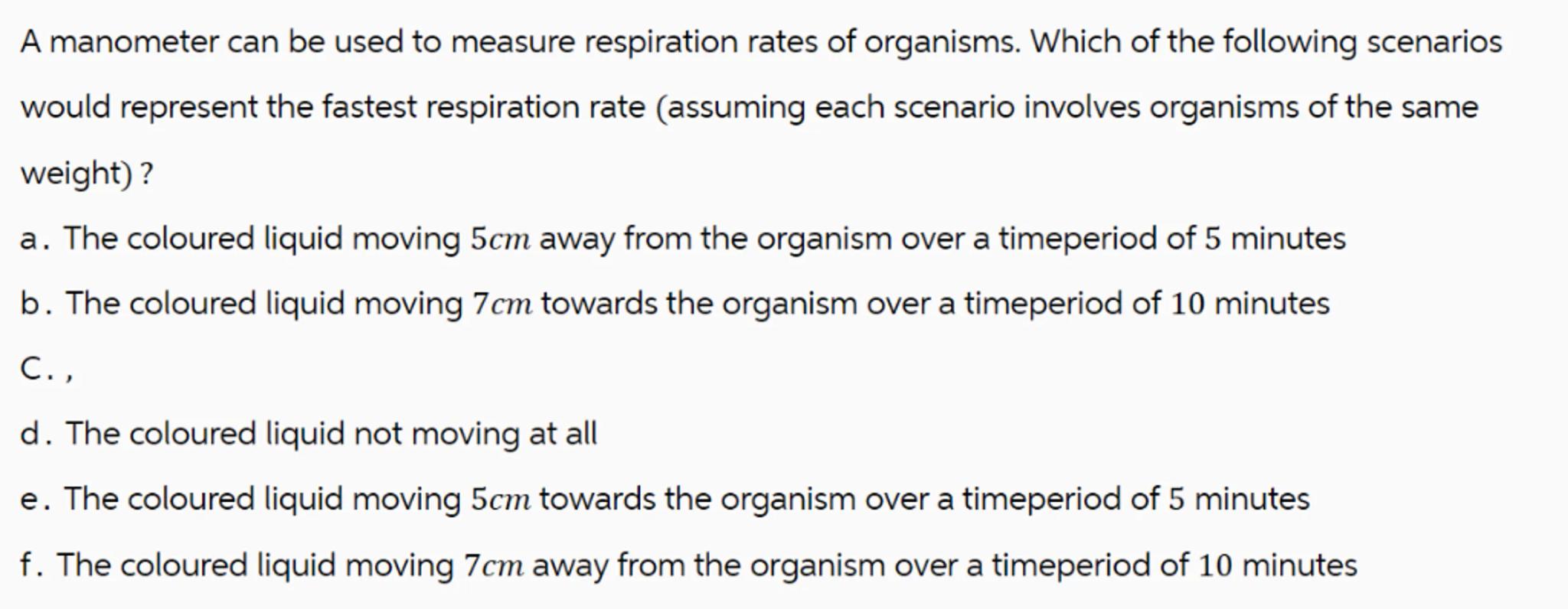 A manometer can be used to measure respiration rates of organisms. Which of the following scenarios would represent the fastest respiration rate (assuming each scenario involves organisms of the same weight) ?
