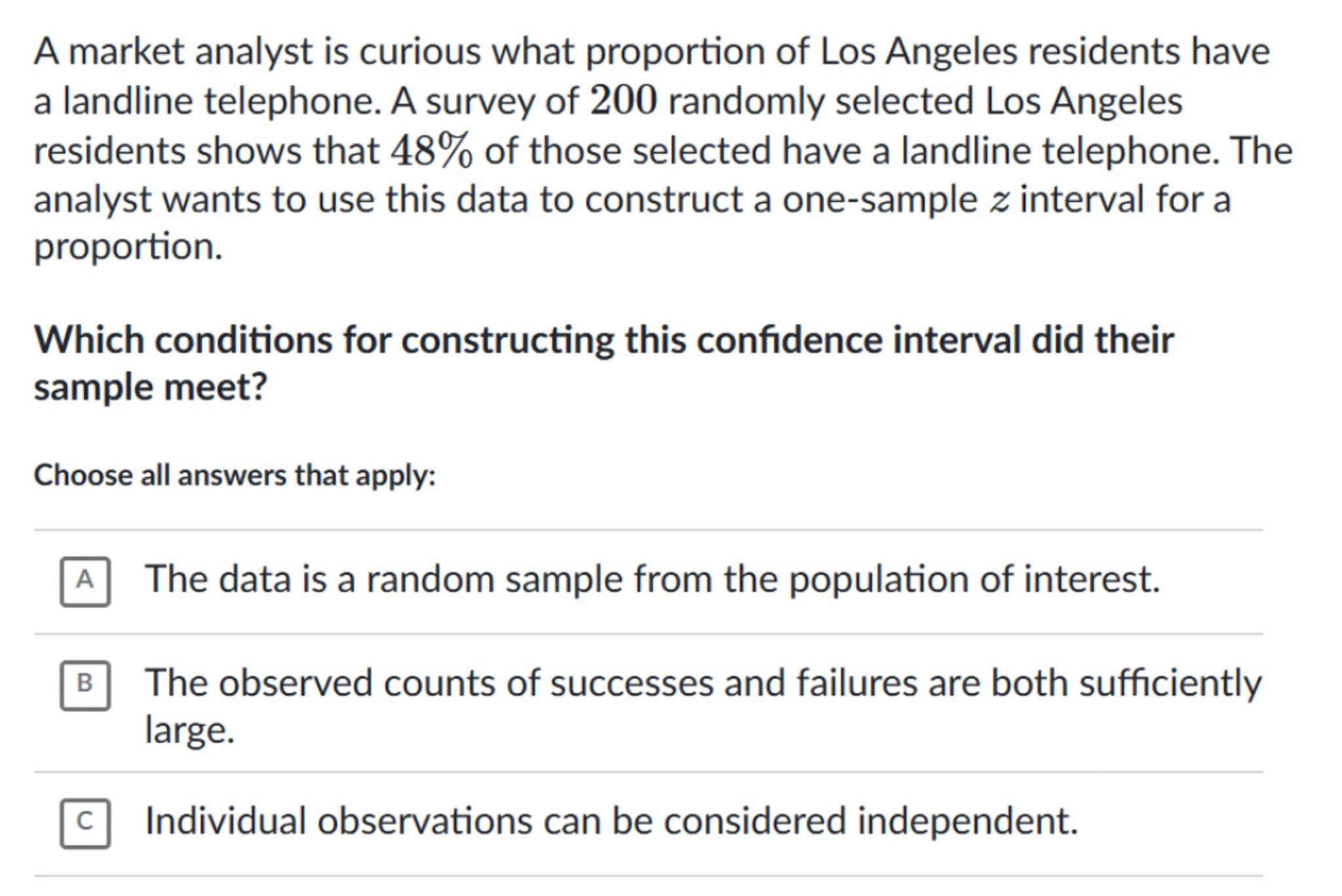 A market analyst is curious what proportion of Los Angeles residents have a landline telephone. A survey of 200 randomly selected Los Angeles residents shows that of those selected have a landline telephone. The analyst wants to use this data to construct a one-sample interval for a proportion.