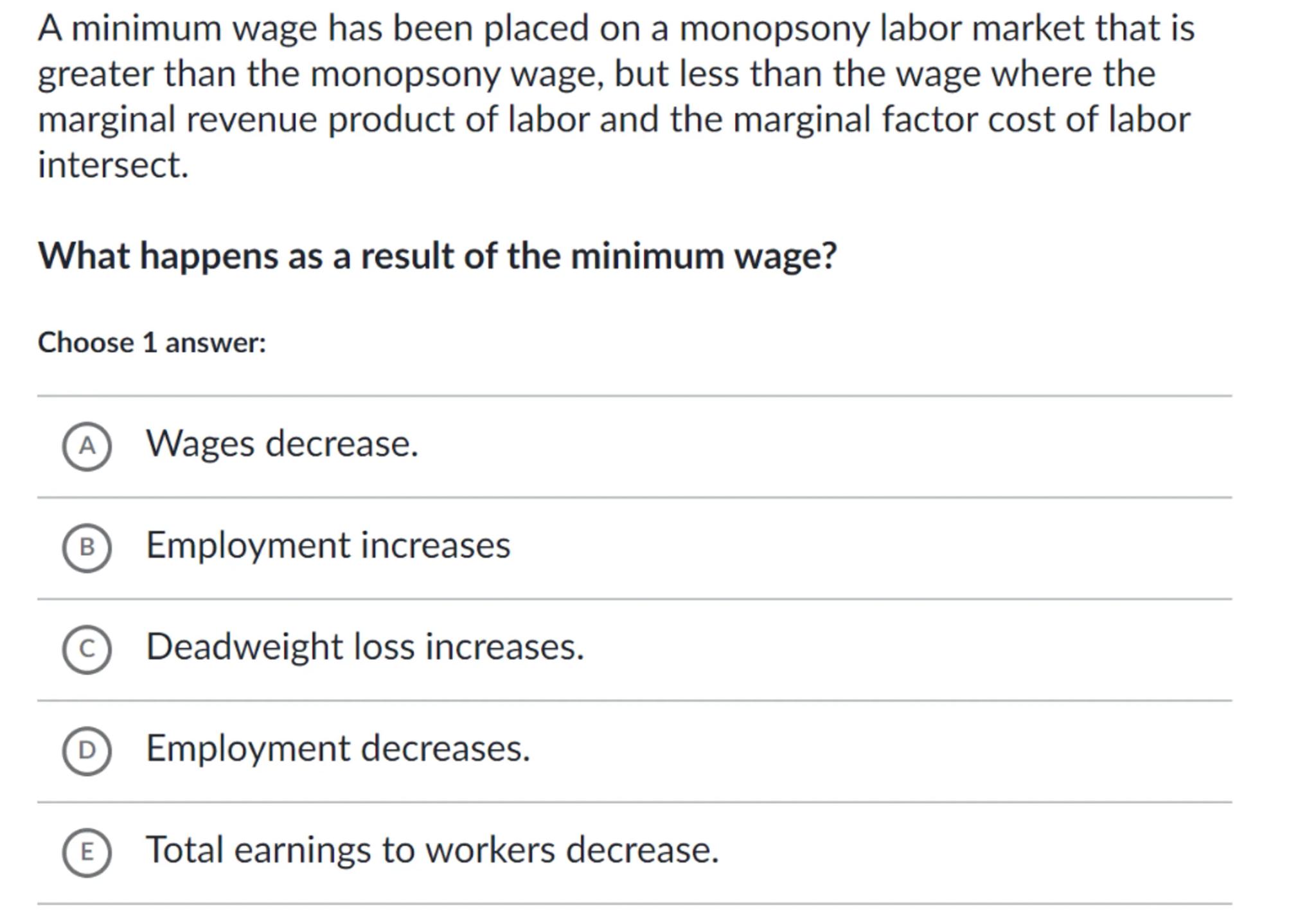 A minimum wage has been placed on a monopsony labor market that is greater than the monopsony wage, but less than the wage where the marginal revenue product of labor and the marginal factor cost of labor intersect.