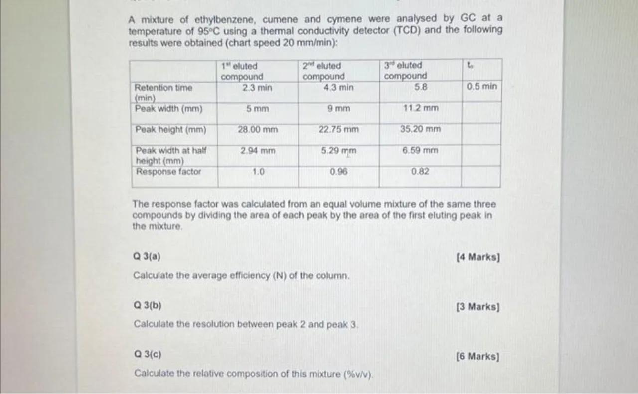 A mixture of ethylbenzene, cumene and cymene were analysed by GC at a temperature of using a thermal conductivity detector (TCD) and the following results were obtained (chart speed ):