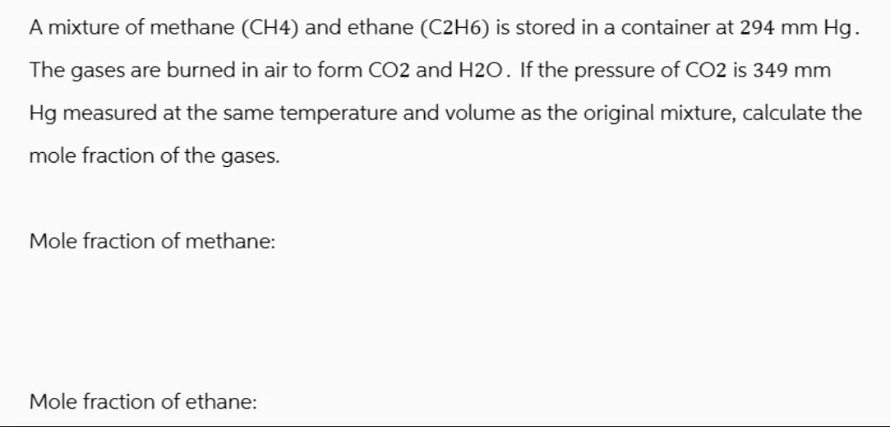 A mixture of methane and ethane is stored in a container at . The gases are burned in air to form and . If the pressure of is measured at the same temperature and volume as the original mixture, calculate the mole fraction of the gases.