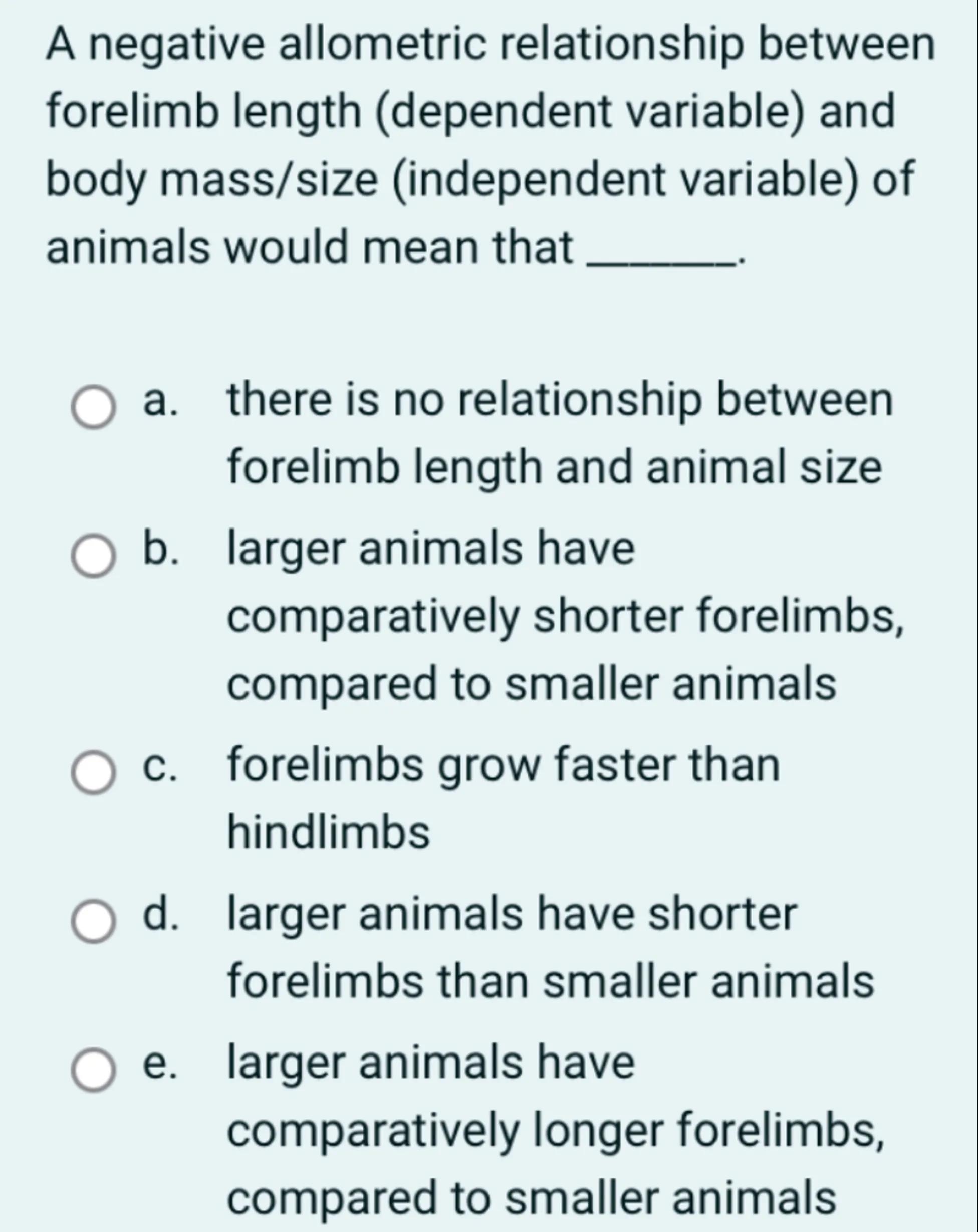 A negative allometric relationship between forelimb length (dependent variable) and body mass/size (independent variable) of animals would mean that