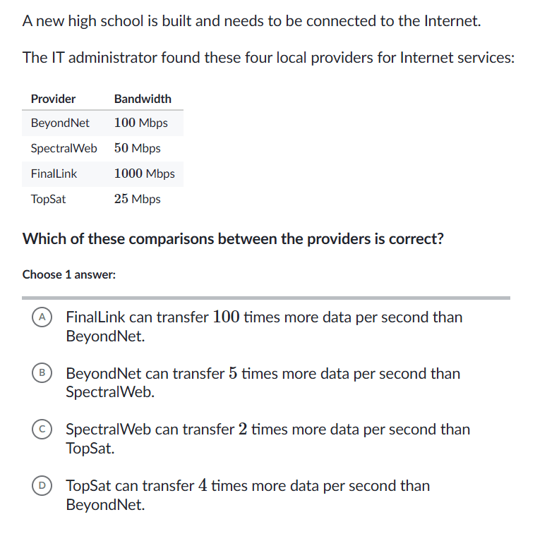 - TopSat has 25 Mbps, and BeyondNet has 100 Mbps. The ratio is , not 4. So, this is incorrect.