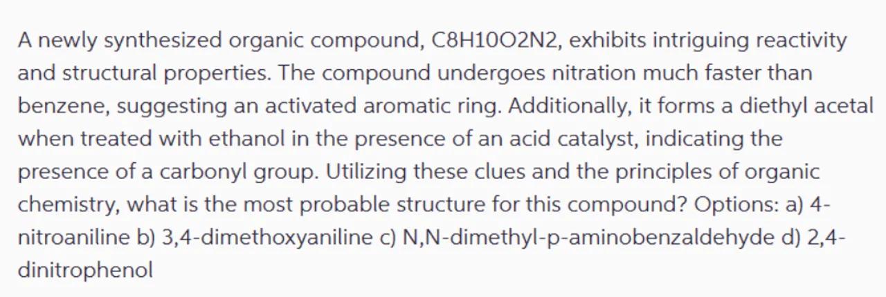 A newly synthesized organic compound, , exhibits intriguing reactivity and structural properties. The compound undergoes nitration much faster than benzene, suggesting an activated aromatic ring. Additionally, it forms a diethyl acetal when treated with ethanol in the presence of an acid catalyst, indicating the presence of a carbonyl group. Utilizing these clues and the principles of organic chemistry, what is the most probable structure for this compound? Options: a) 4nitroaniline b) 3,4-dimethoxyaniline c) N,N-dimethyl-p-aminobenzaldehyde d) 2,4dinitrophenol