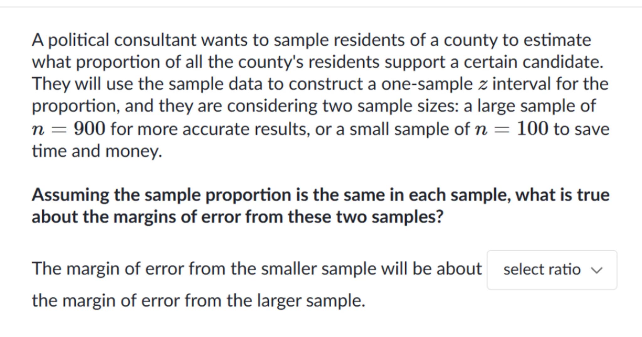 The margin of error from the smaller sample will be about select ratio the margin of error from the larger sample.