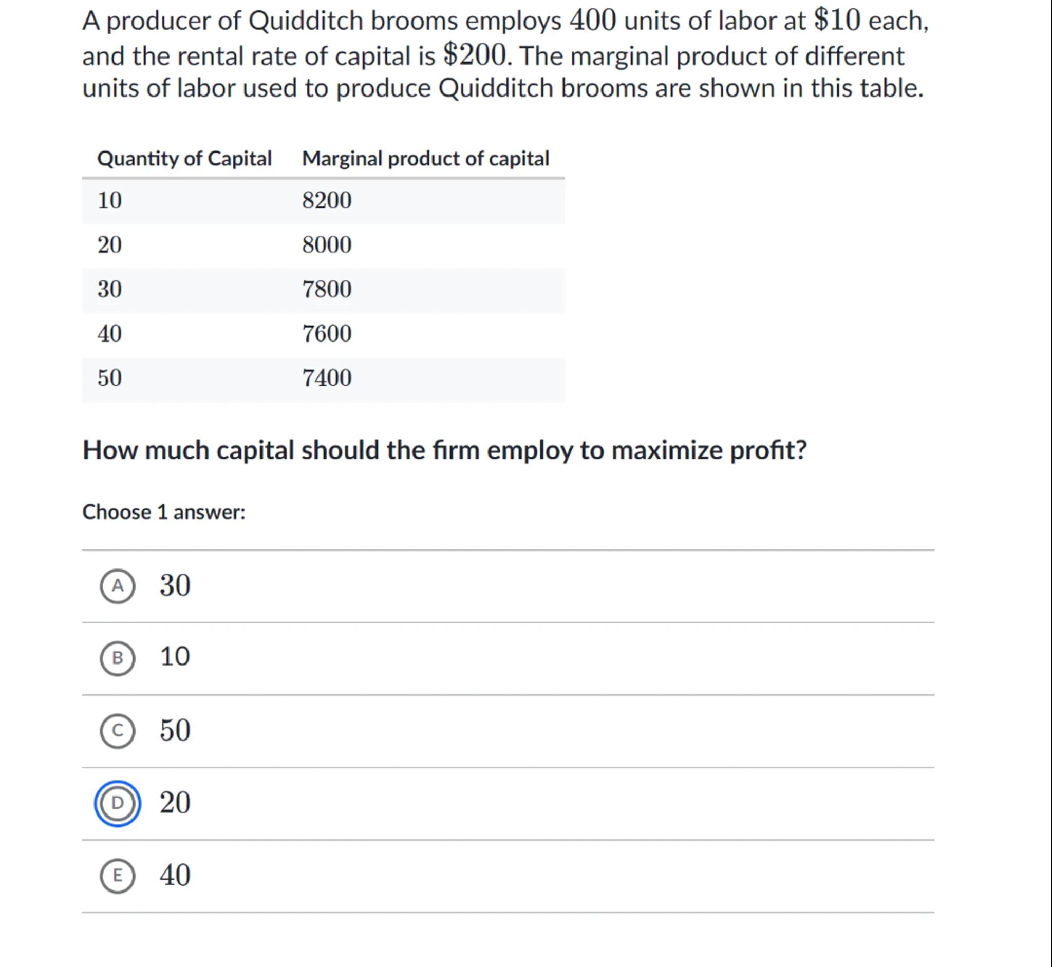 A producer of Quidditch brooms employs 400 units of labor at each, and the rental rate of capital is . The marginal product of different units of labor used to produce Quidditch brooms are shown in this table.