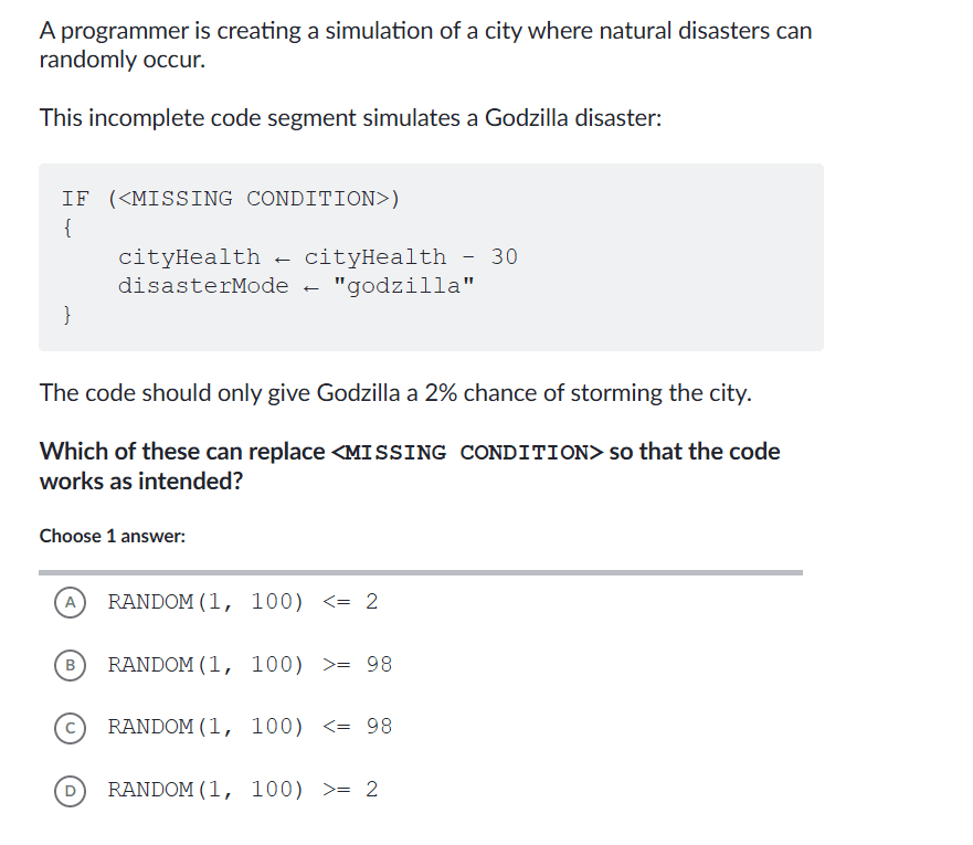4. Option D: `RANDOM(1, 100) >= 2`