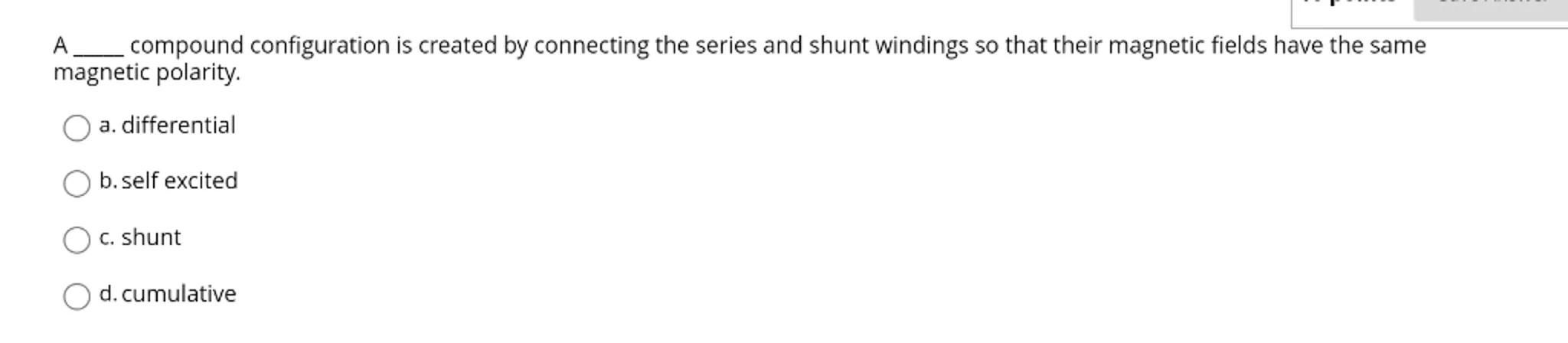 Hi Vic! Great to see your question. The type of compound configuration created by connecting series and shunt windings so that their magnetic fields have the same magnetic polarity is known as a cumulative configuration. This means that the magnetic fields reinforce each other, which is essential for certain types of electrical machines. If you have any more questions or need further clarification, feel free to ask!Not the question you are looking for? Ask here!
