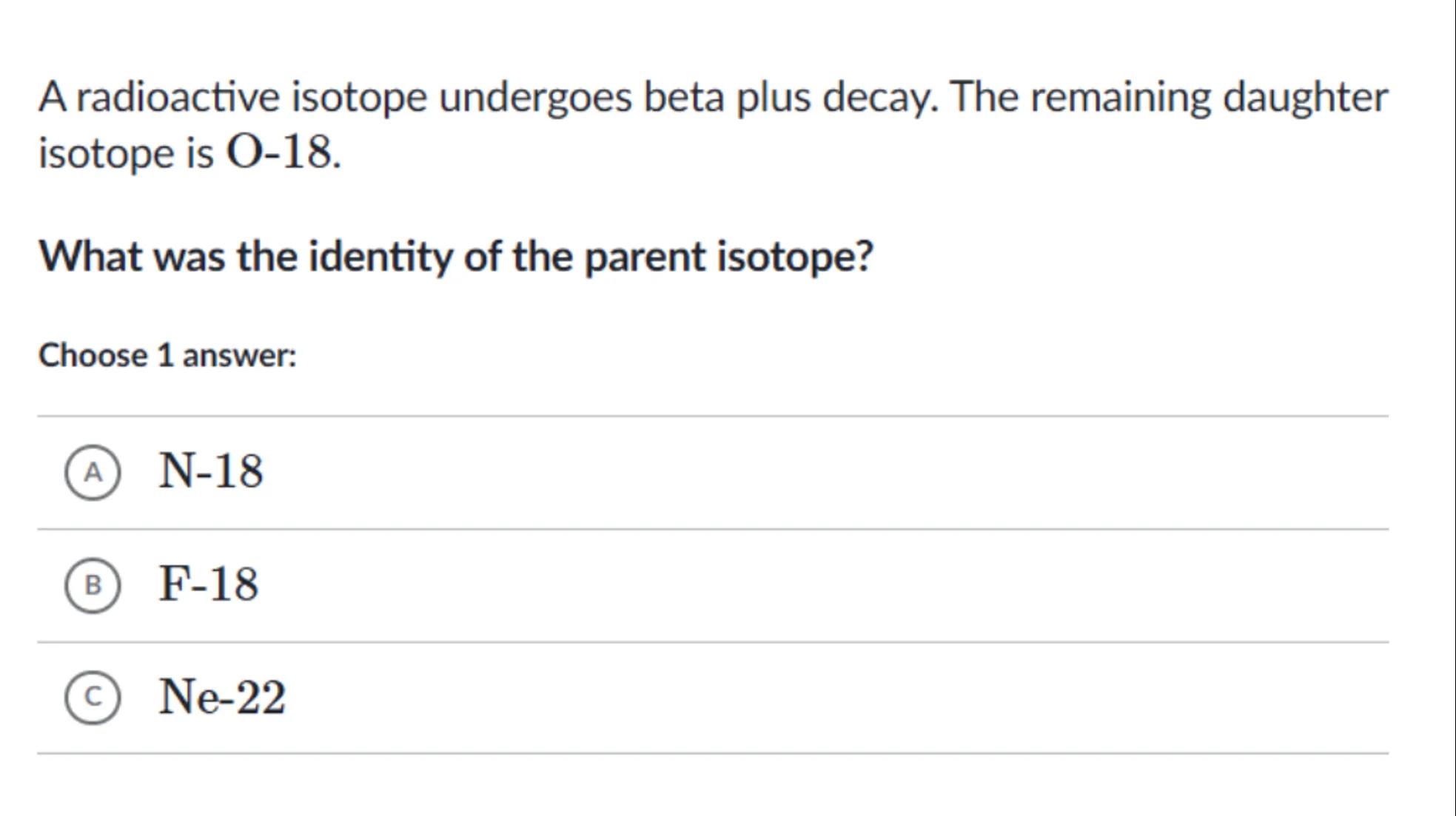 A radioactive isotope undergoes beta plus decay. The remaining daughter isotope is .