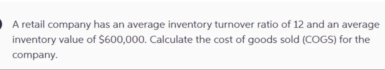 A retail company has an average inventory turnover ratio of 12 and an average inventory value of . Calculate the cost of goods sold (COGS) for the company.