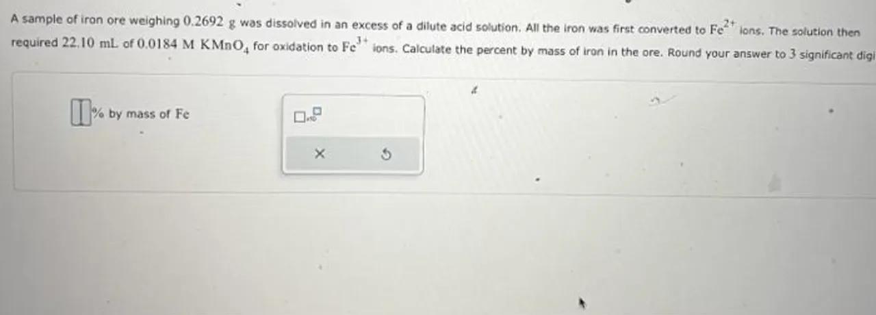 A sample of iron ore weighing was dissolved in an excess of a dilute acid solution. All the iron was first converted to ions. The solution then required of for oxidation to ions. Calculate the percent by mass of iron in the ore. Round your answer to 3 significant digi