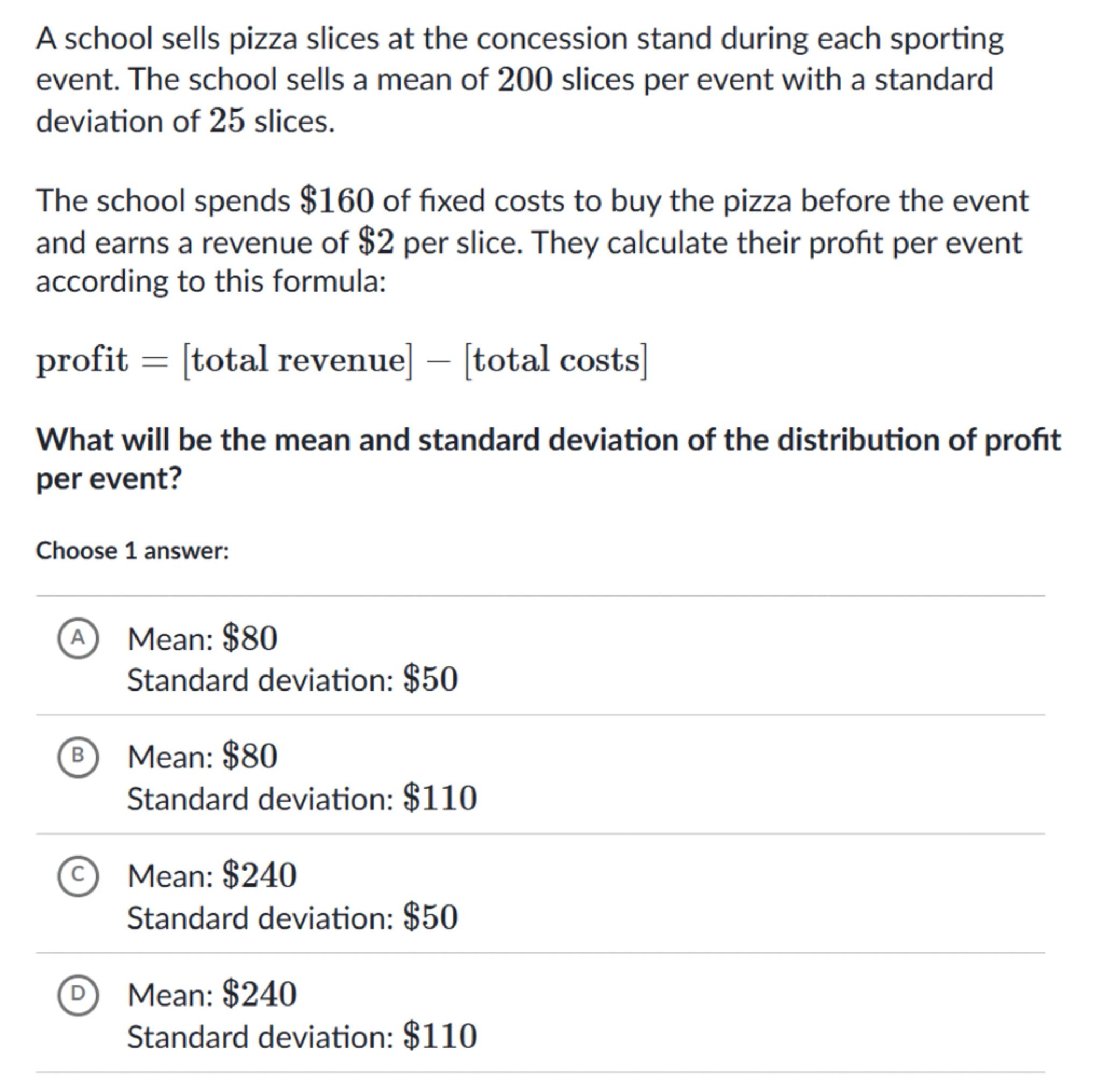 A school sells pizza slices at the concession stand during each sporting event. The school sells a mean of 200 slices per event with a standard deviation of 25 slices.