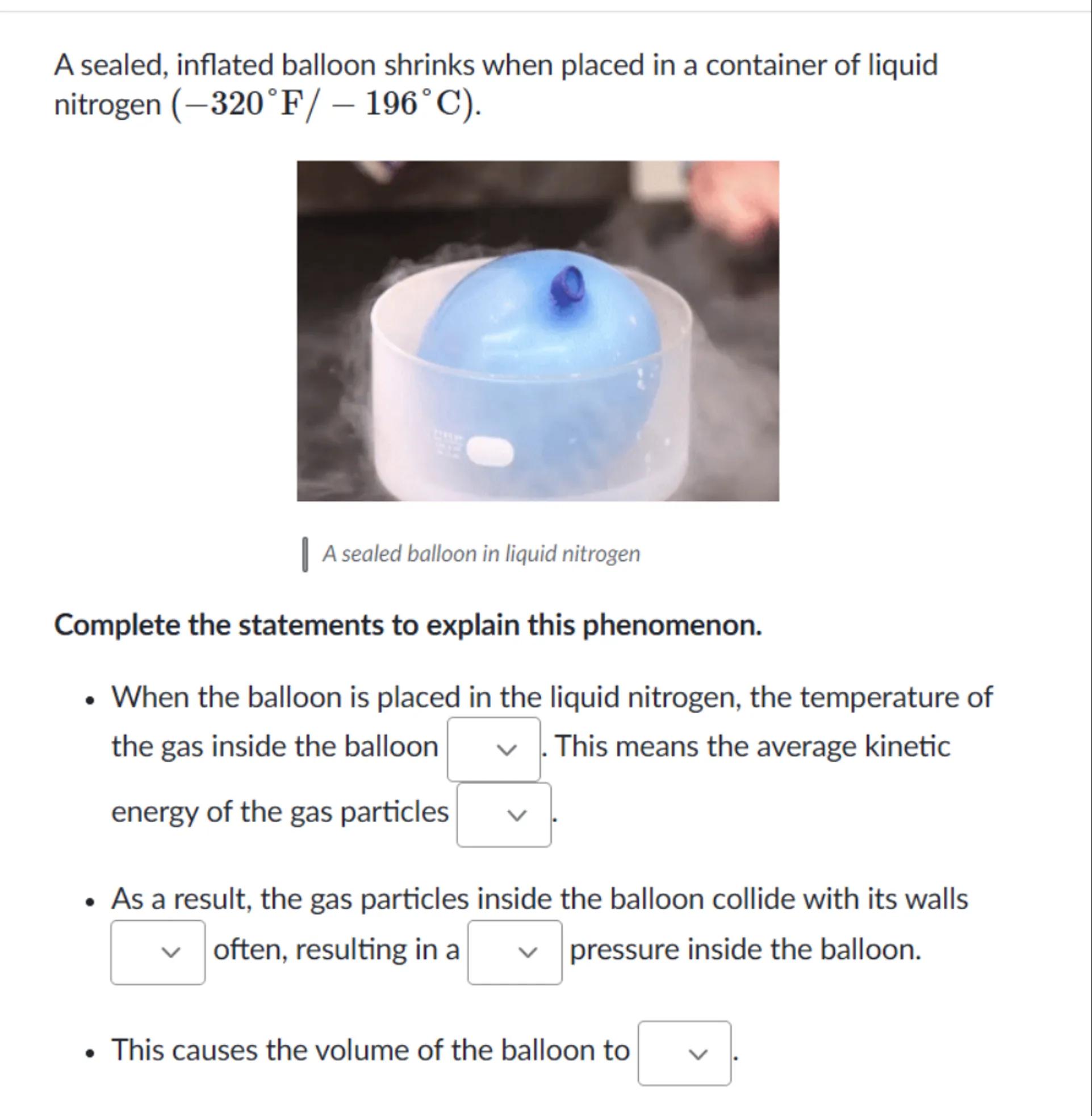 - When the balloon is placed in the liquid nitrogen, the temperature of the gas inside the balloon . This means the average kinetic energy of the gas particles