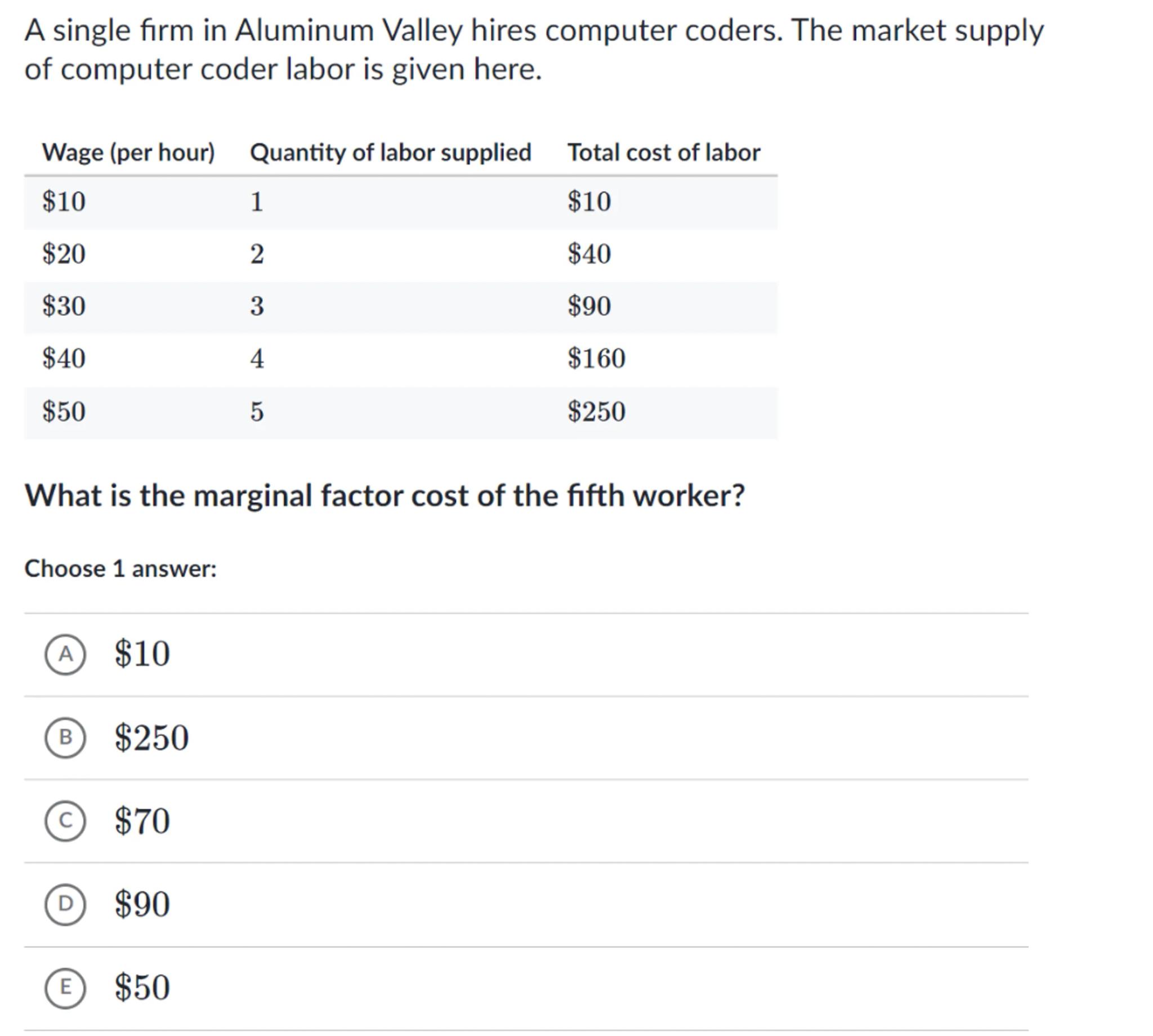 A single firm in Aluminum Valley hires computer coders. The market supply of computer coder labor is given here.