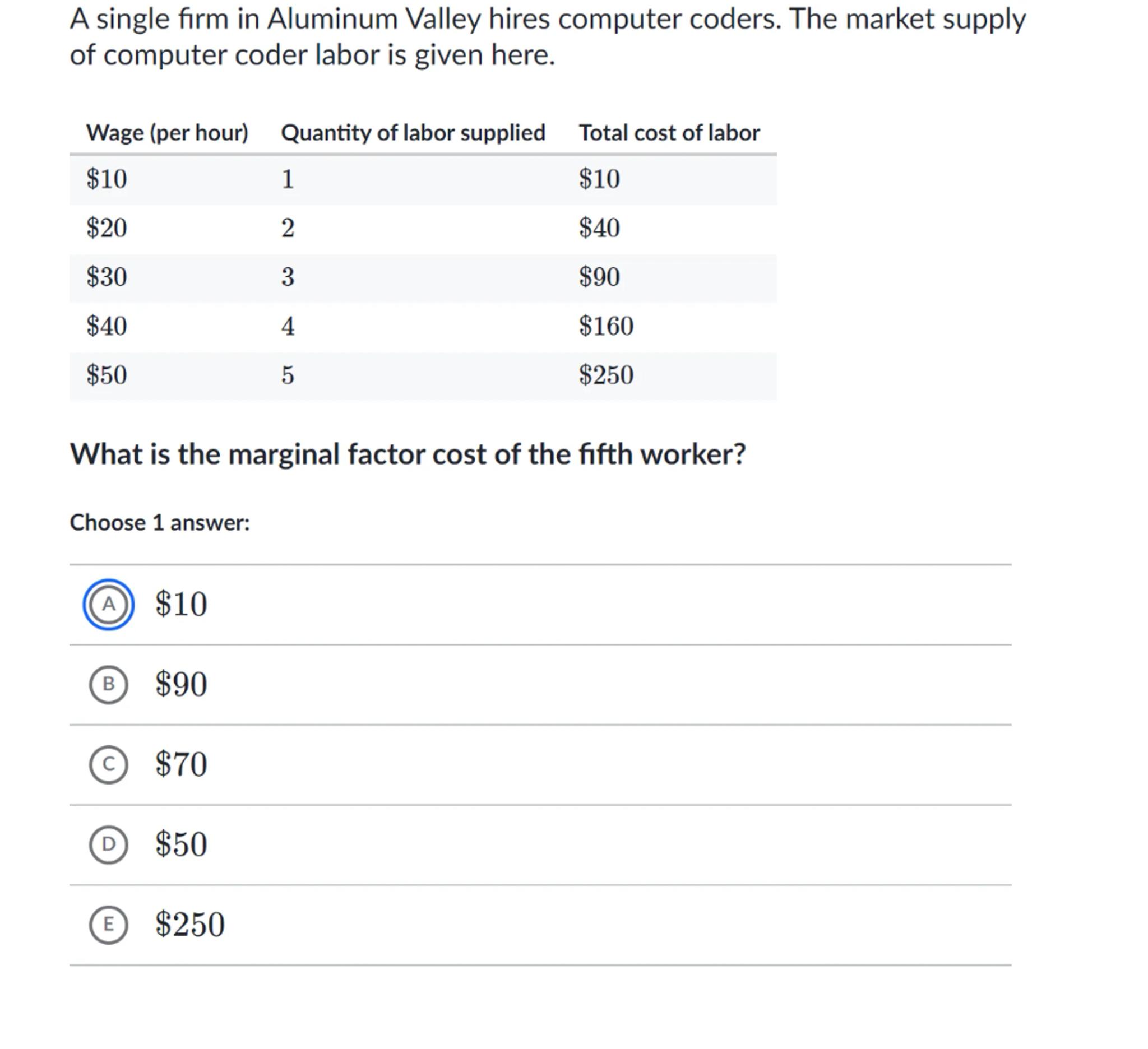 A single firm in Aluminum Valley hires computer coders. The market supply of computer coder labor is given here.
