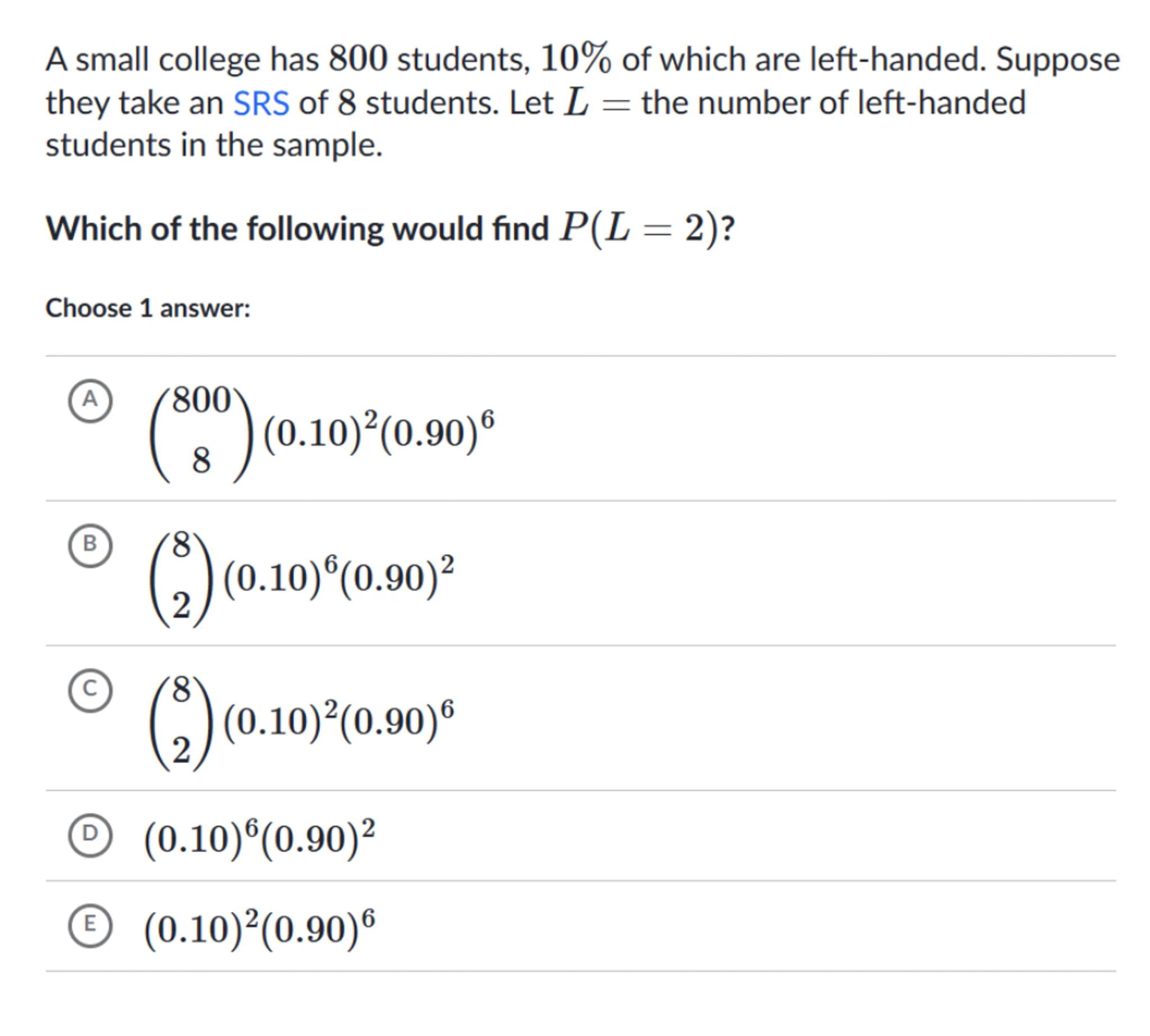 A small college has 800 students, of which are left-handed. Suppose they take an SRS of 8 students. Let the number of left-handed students in the sample.