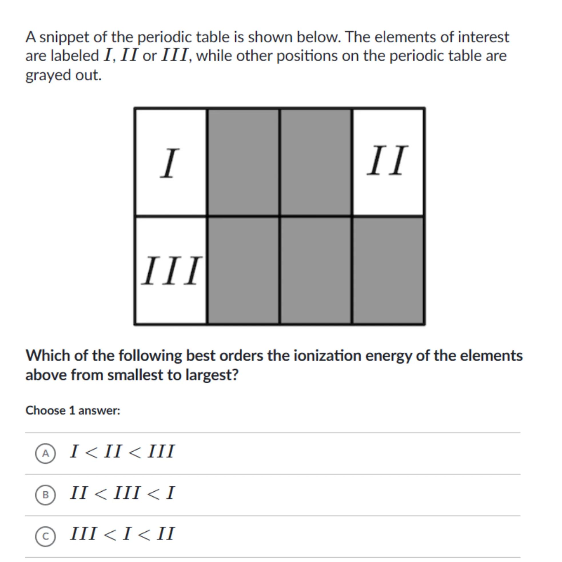 Which of the following best orders the ionization energy of the elements above from smallest to largest?