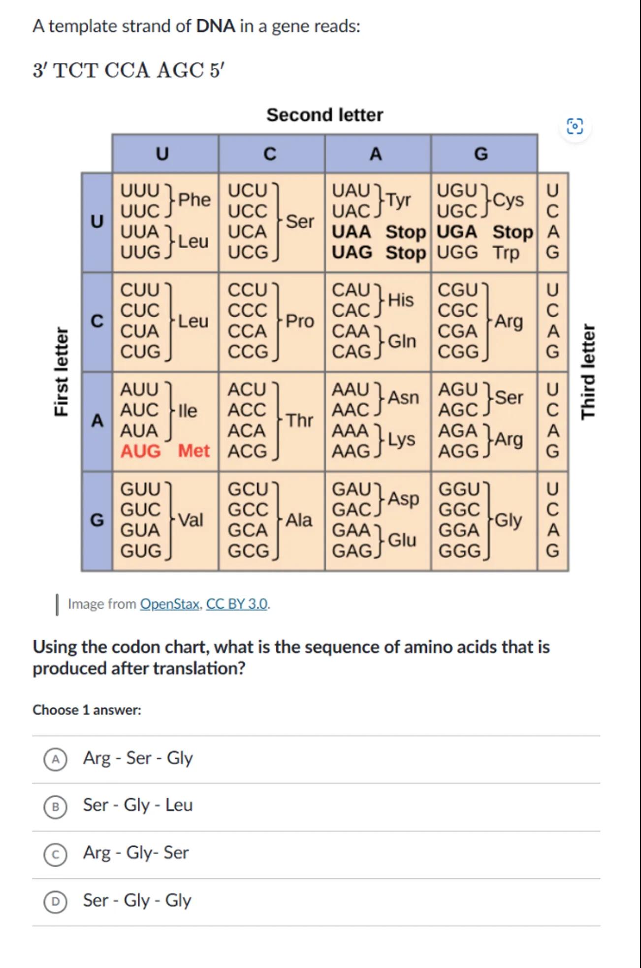 Using the codon chart, what is the sequence of amino acids that is produced after translation?