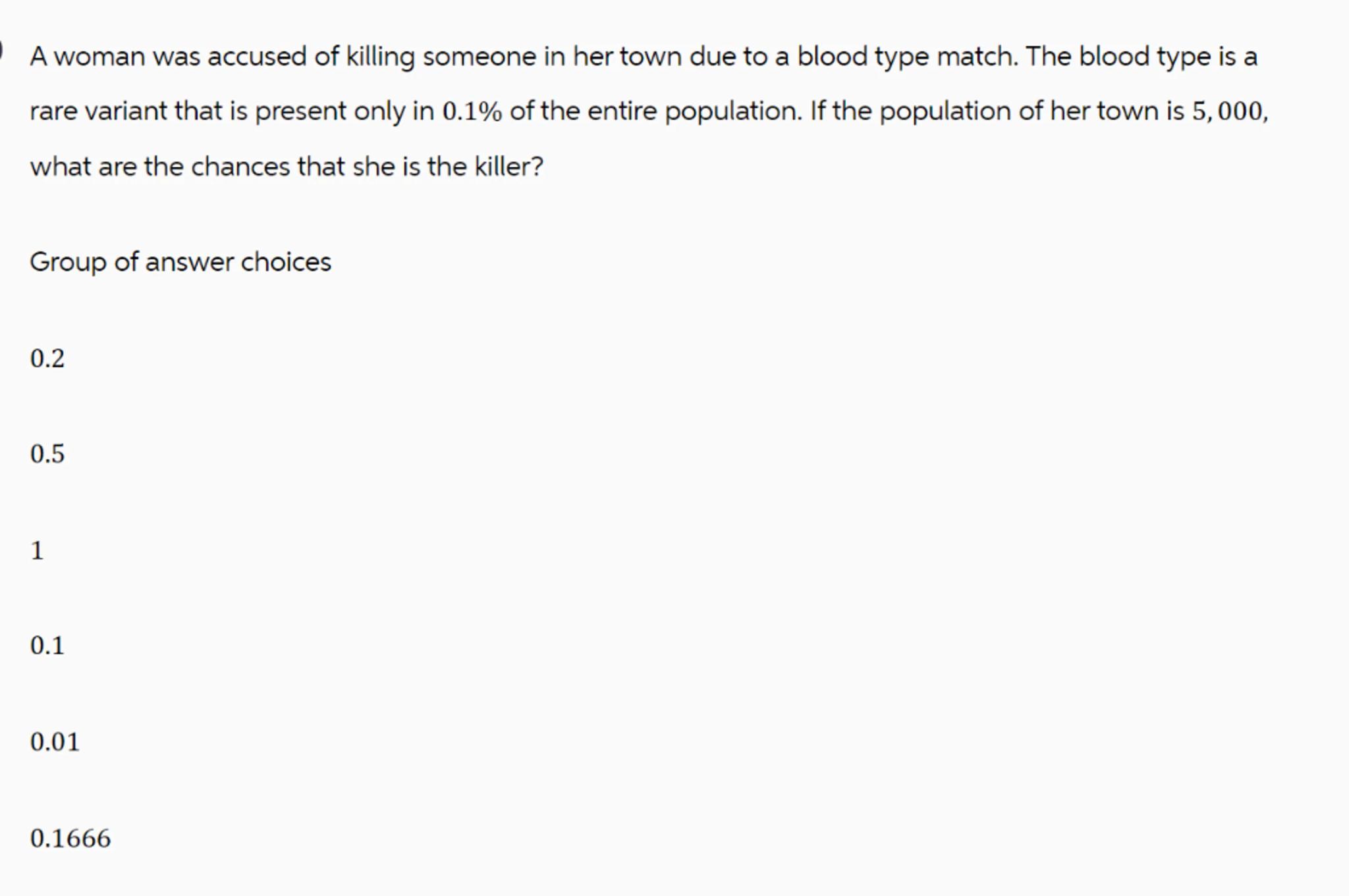 A woman was accused of killing someone in her town due to a blood type match. The blood type is a rare variant that is present only in of the entire population. If the population of her town is 5,000 , what are the chances that she is the killer?