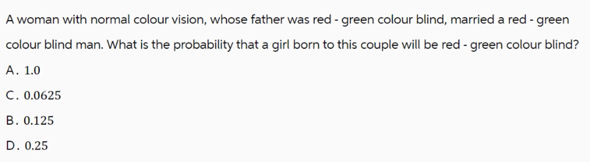 A woman with normal colour vision, whose father was red - green colour blind, married a red - green colour blind man. What is the probability that a girl born to this couple will be red - green colour blind?