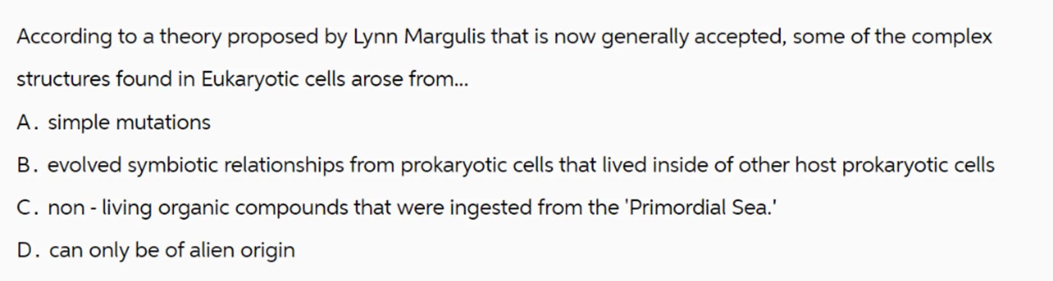 According to a theory proposed by Lynn Margulis that is now generally accepted, some of the complex structures found in Eukaryotic cells arose from...