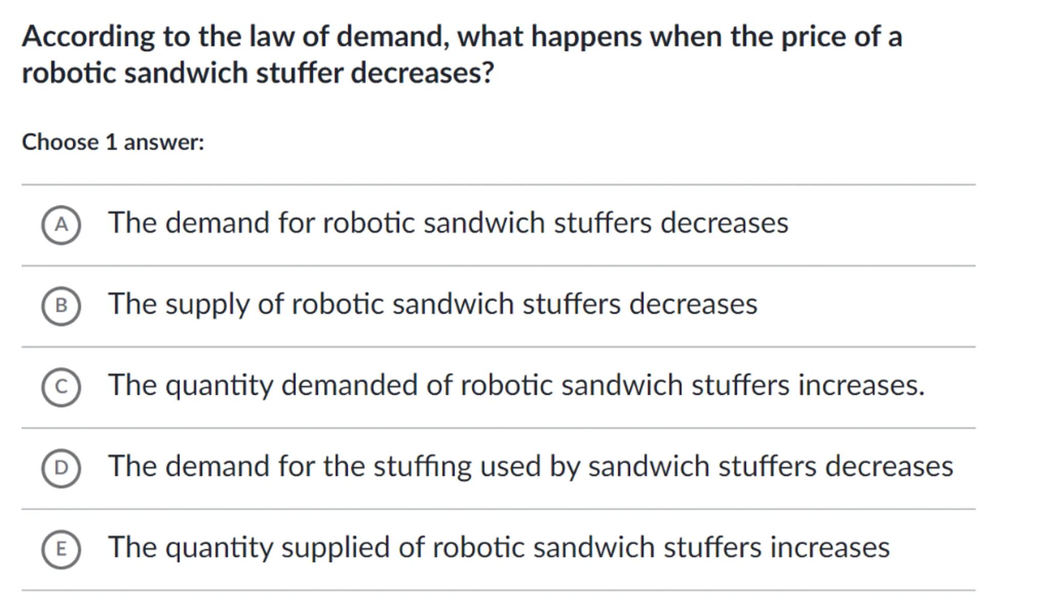 According to the law of demand, what happens when the price of a robotic sandwich stuffer decreases?