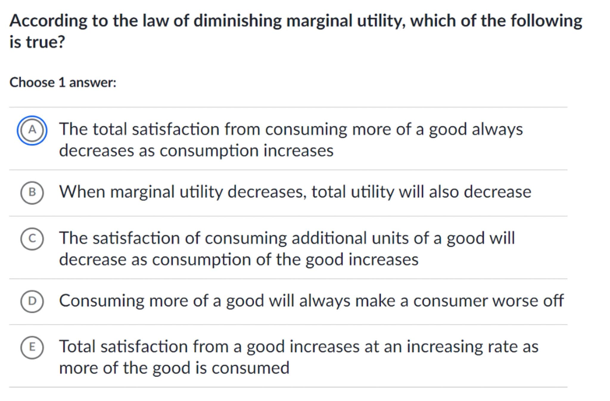 (A) The total satisfaction from consuming more of a good always decreases as consumption increases