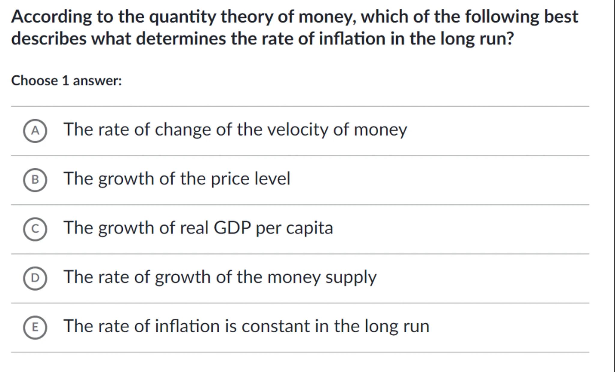 According to the quantity theory of money, which of the following best describes what determines the rate of inflation in the long run?
