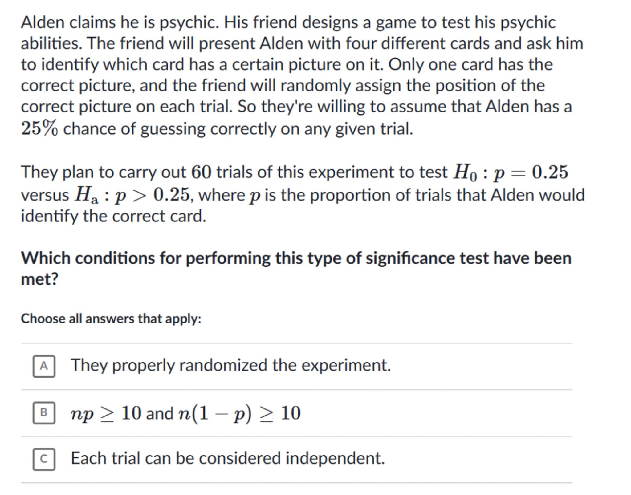 Alden claims he is psychic. His friend designs a game to test his psychic abilities. The friend will present Alden with four different cards and ask him to identify which card has a certain picture on it. Only one card has the correct picture, and the friend will randomly assign the position of the correct picture on each trial. So they're willing to assume that Alden has a chance of guessing correctly on any given trial.
